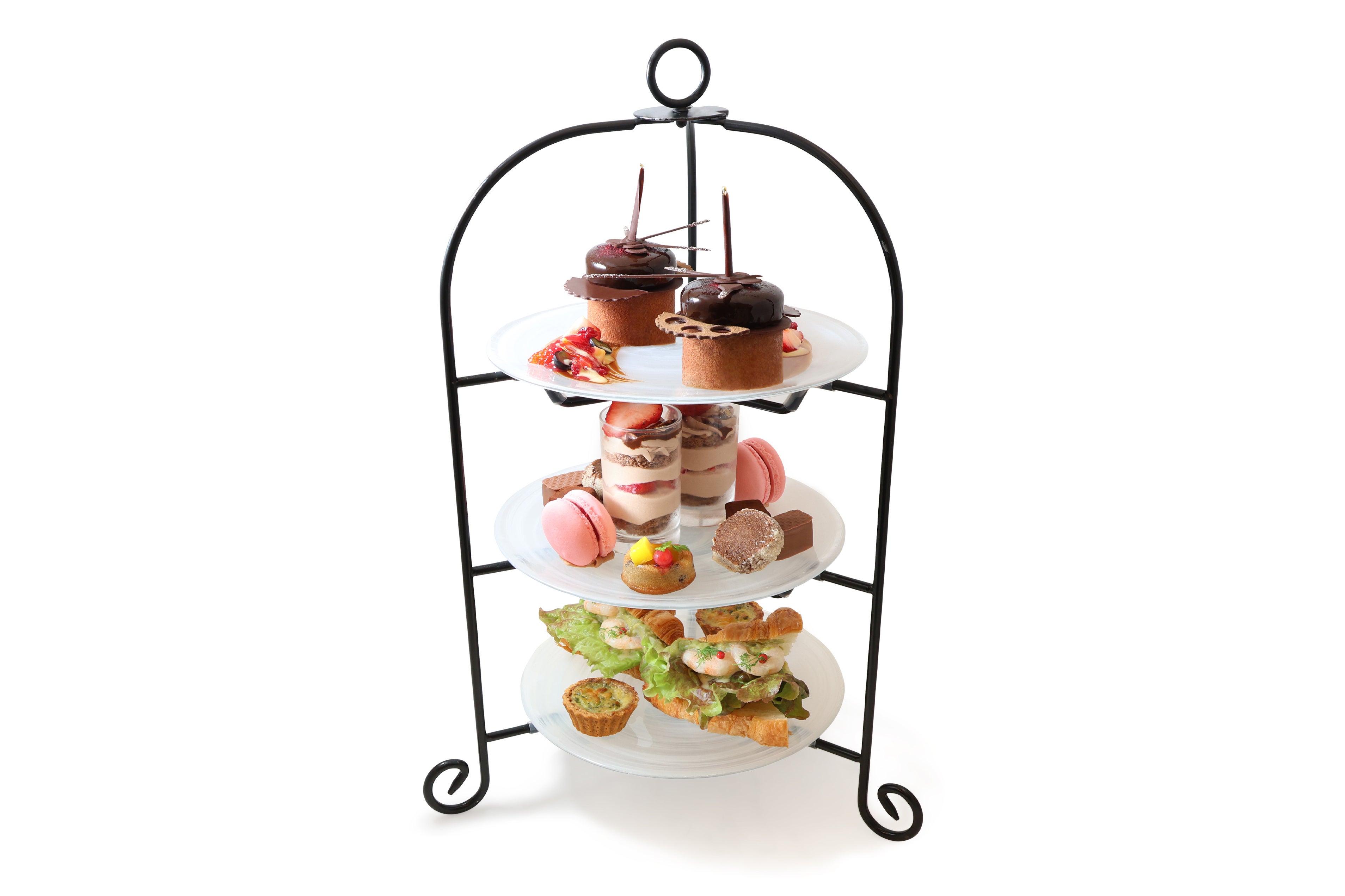 5周年限定の特別アフタヌーンティーでは、上段にアニバーサリーデセールをアフタヌーンティーサイズでご用意。中段にはチョコショートケーキのグラス仕立て、生チョコ、ココナッツサブレ、チョコチップフィナンシェ、フランボワーズマカロン、ボンボンショコラなど、ショコラの魅力を詰め込んだスイーツが並びます。さらに、エビとアボカドのクロワッサンサンドやミニキッシュなど軽食も充実。特別な記念日にふさわしい贅沢な内容です。