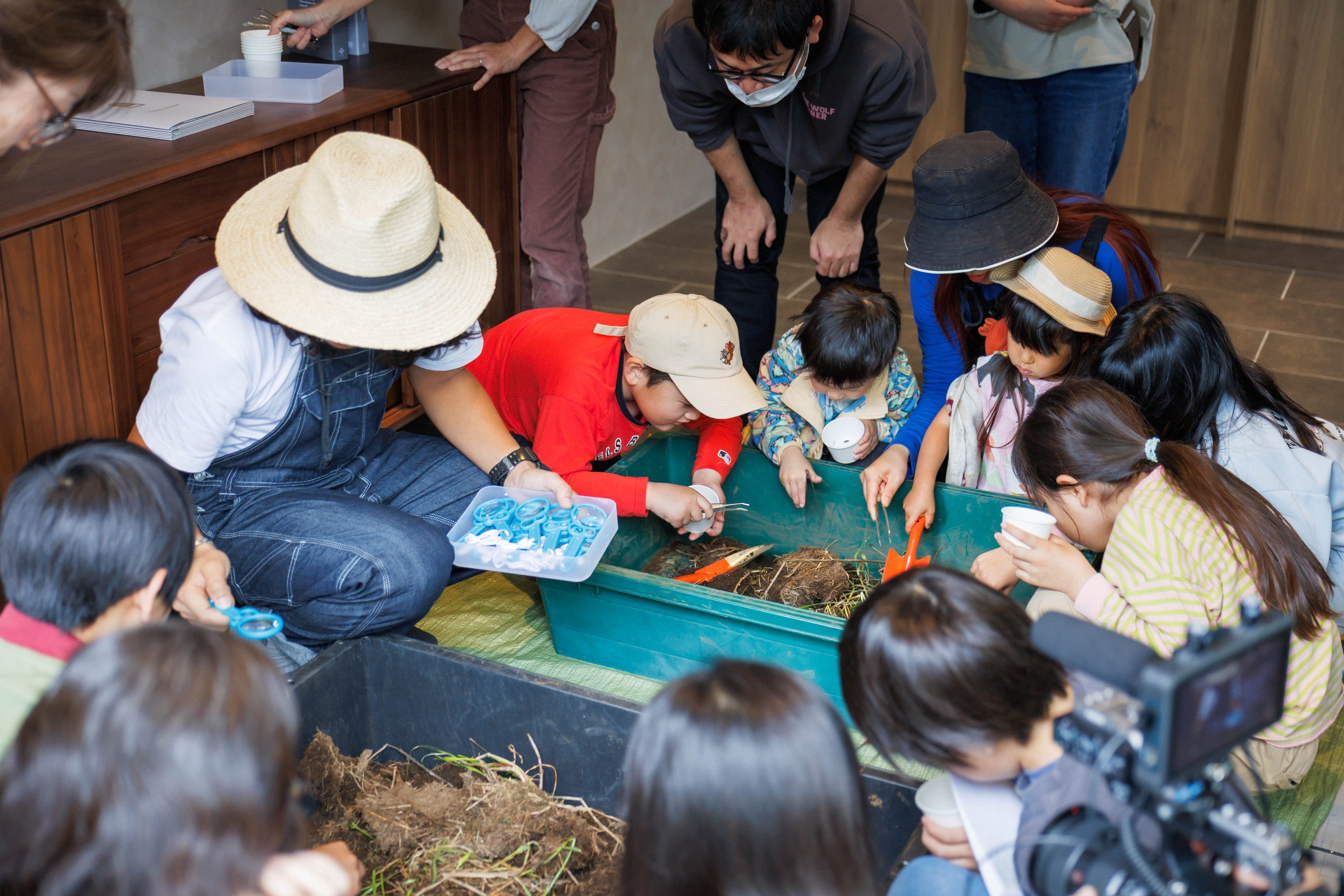 子どもたちは虫眼鏡や観察道具を使い、普段目にすることのない「土の中の世界」を観察。