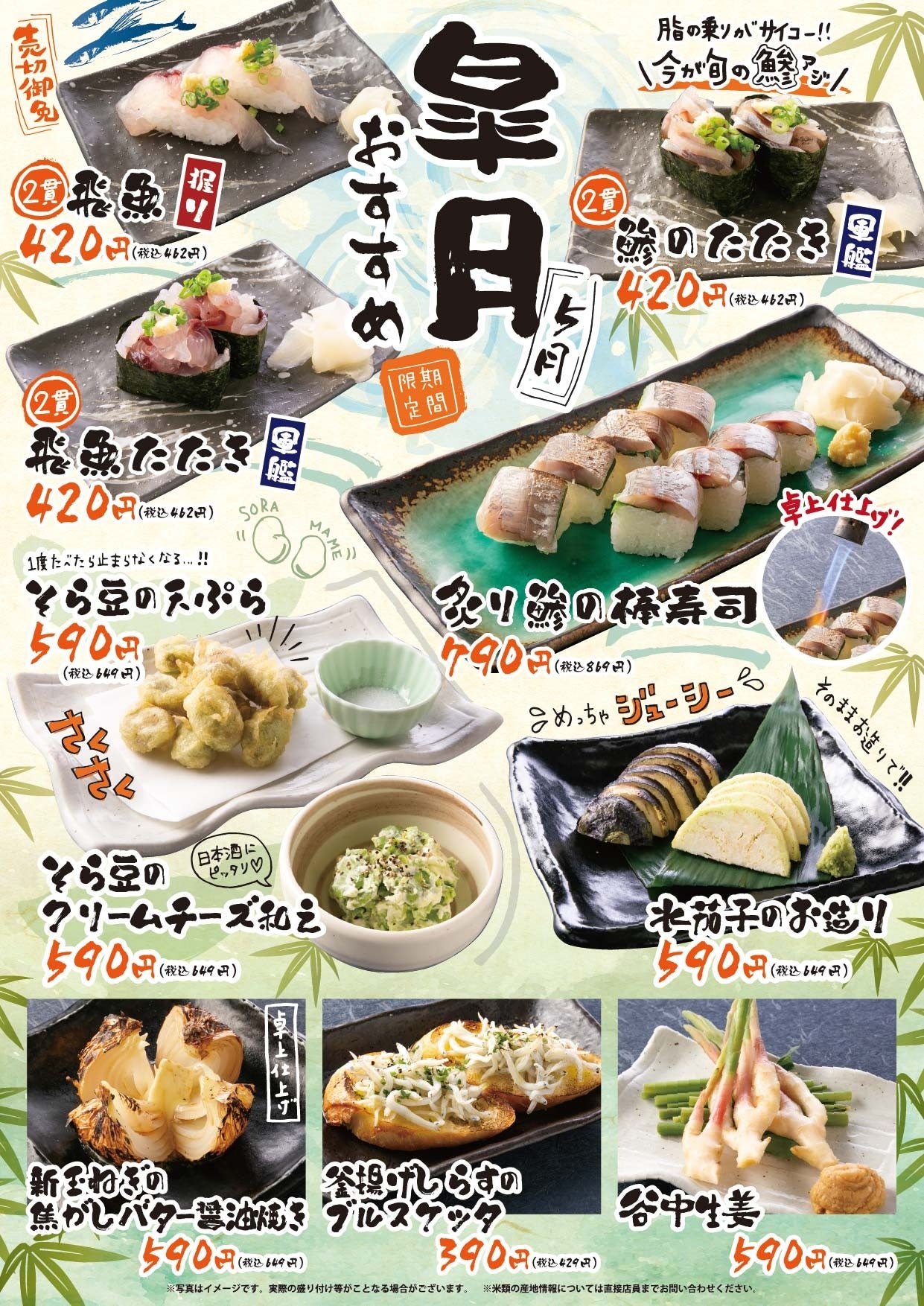 東京と埼玉で展開する海鮮居酒屋「地魚屋」では毎月、季節の旬な素材を使用した限定メニューを販売しています。5月は10種類。気温の上昇と共に初夏を感じる季節に合うお料理を揃えました。さっぱりした味わいの「飛魚」に脂の乗った「鯵」。季節の香りただよう、さくっとした食感の「そら豆」。そして、バゲットの歯ごたえとしらすのふんわり感を同時に楽しめる「釜揚げしらすのブルスケッタ」などをご用意いたしました。どうぞ、この機会にご利用ください。皆様のご来店を心よりお待ちしております。