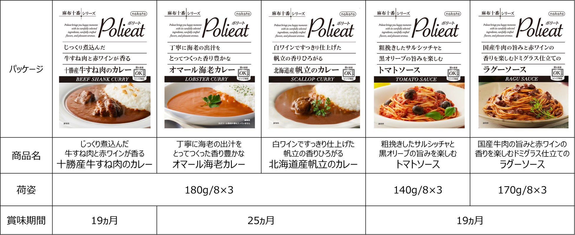 第一弾として、素材の旨みを引き出した「麻布十番シリーズ Polieat(ポリート)」全5品を先行発売。その後、カレーやシチュー、パスタソースなど全15品を段階的にレンジ対応へとアップデートし、現代の多様なライフスタイルに寄り添う新しい「麻布十番シリーズ」を展開します。