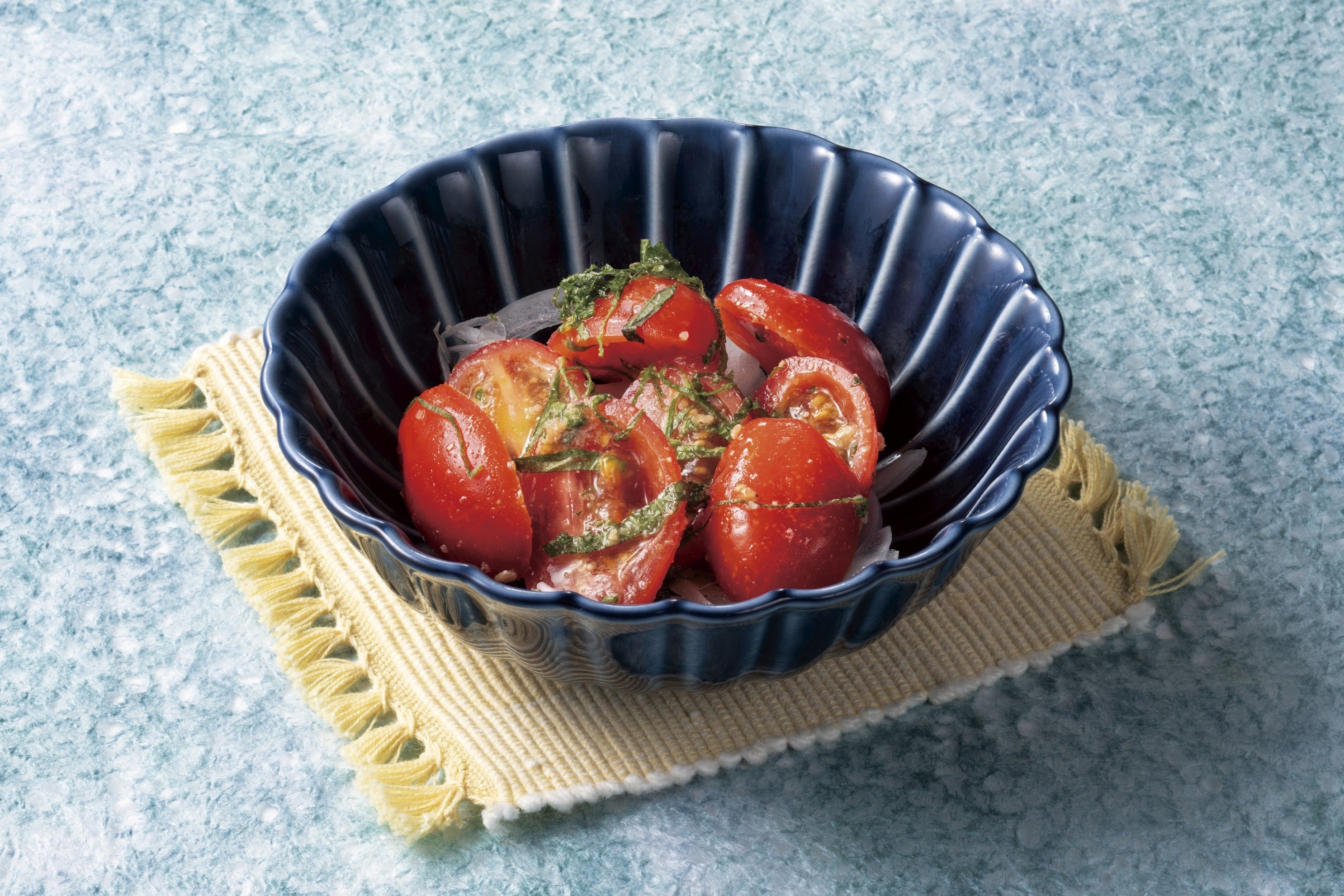 爽やかでみずみずしいフラガールトマトを、胡麻とごま油の香ばしいソースでマリネし、大葉を合わせた、香り豊かな一皿です。