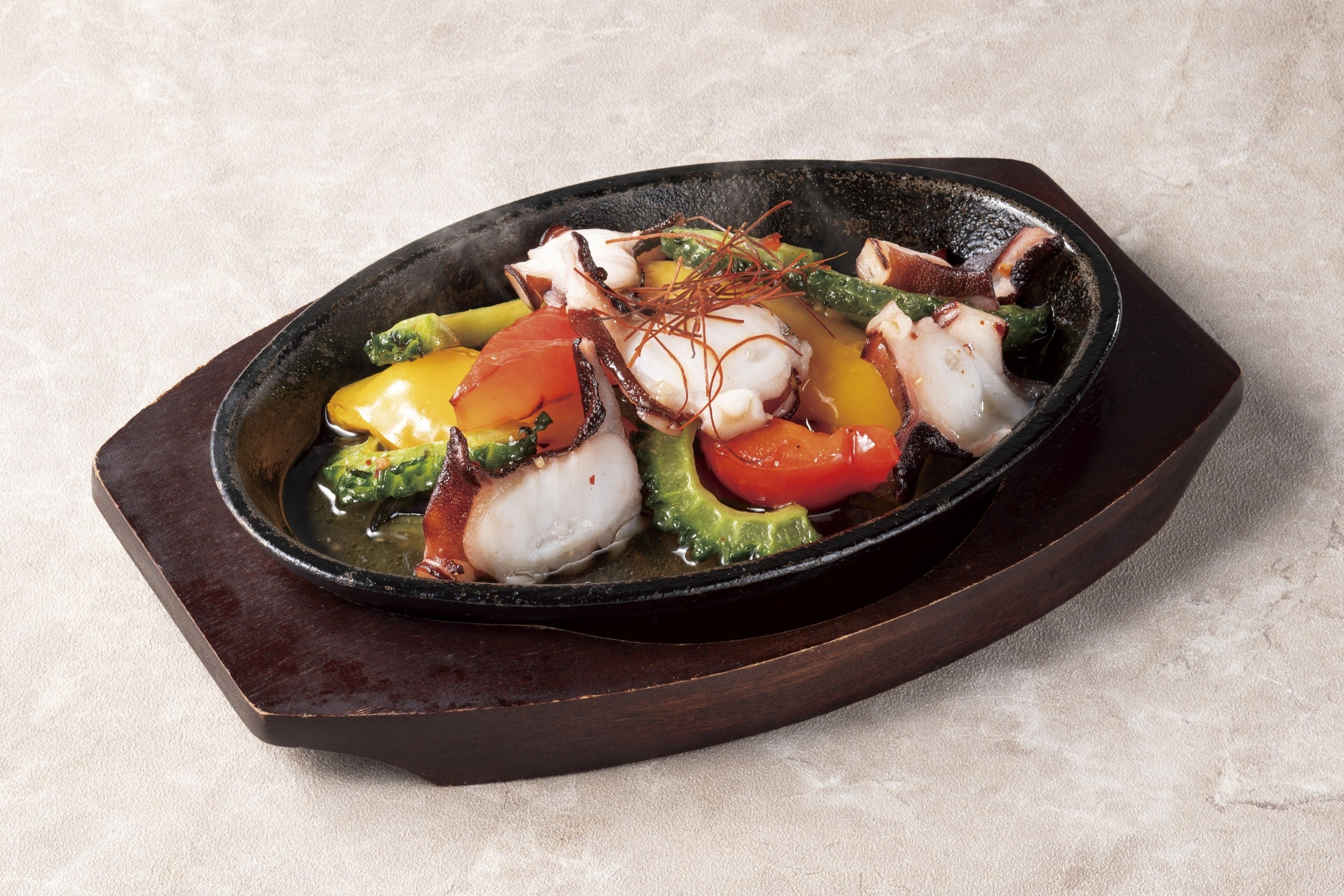 近海茶蛸と色鮮やかな夏野菜をサッと炒めました。ガーリックの香りが食欲を引き立てます。