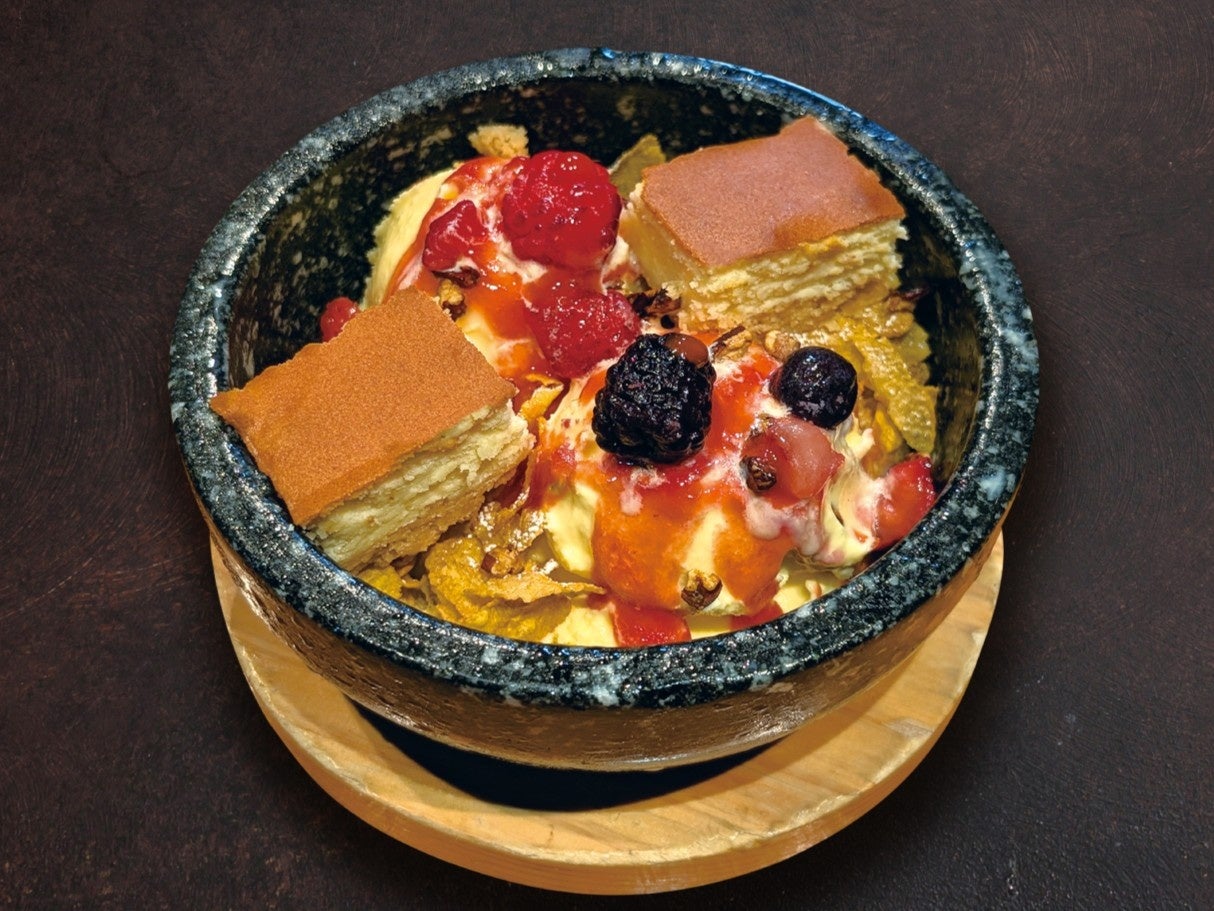 デザートでは、バニラアイスに濃厚なNYチーズケーキと甘酸っぱいストロベリーソースをトッピングm冷たい石の器で豪快に練って、お召し上がりいただく「NYチーズケーキのストーンアイス」を提供します。