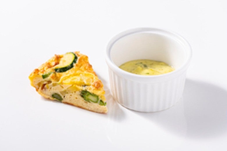 スコーンは、外は香ばしく中はふんわりと焼き上げた「プレーンスコーン」に信州産ルバーブの爽やかな酸味を生かしたジャムと、南瓜を加えた自家製クロテッドクリームを添えました。セイボリーは、カリっと揚げた福味鶏と高原レタスに白味噌ソースを合わせた「福味鶏のタルティーヌ」、ベーコンやアメーラトマト、大根のマリネを巻いたほんのりスパイシーな「ベーコンとアメーラトマトのトルティーヤ」、ケールと香草を混ぜ込んだ爽やかなディップともにお召し上がりいただける、ズッキーニを贅沢に使用した「ズッキーニのフリッタータ」など初夏の味覚を軽やかに楽しめる全 3 品を取り揃えました。