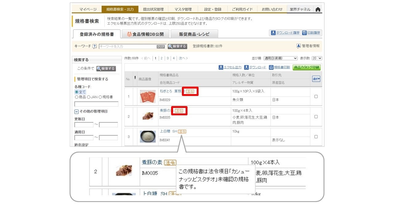 検索画面上で、新基準への対応(規格書の確認・提出)が完了していない商品に「法令」アイコンが表示されます。さらにアイコンにマウスを合わせると、カシューナッツ・ピスタチオのどちらが未対応かを判別可能です。確認が必要な商品が視覚的に強調されるため、管理ミスや更新漏れを未然に防ぎます。