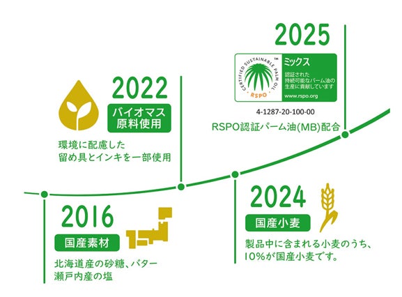 国産素材・国産小麦の使用により、国内自給率の向上に取り組んでいます。さらに、環境や生物多様性、生産者の生活に配慮して生産されたRSPO認証パーム油(MB)を使用しています。