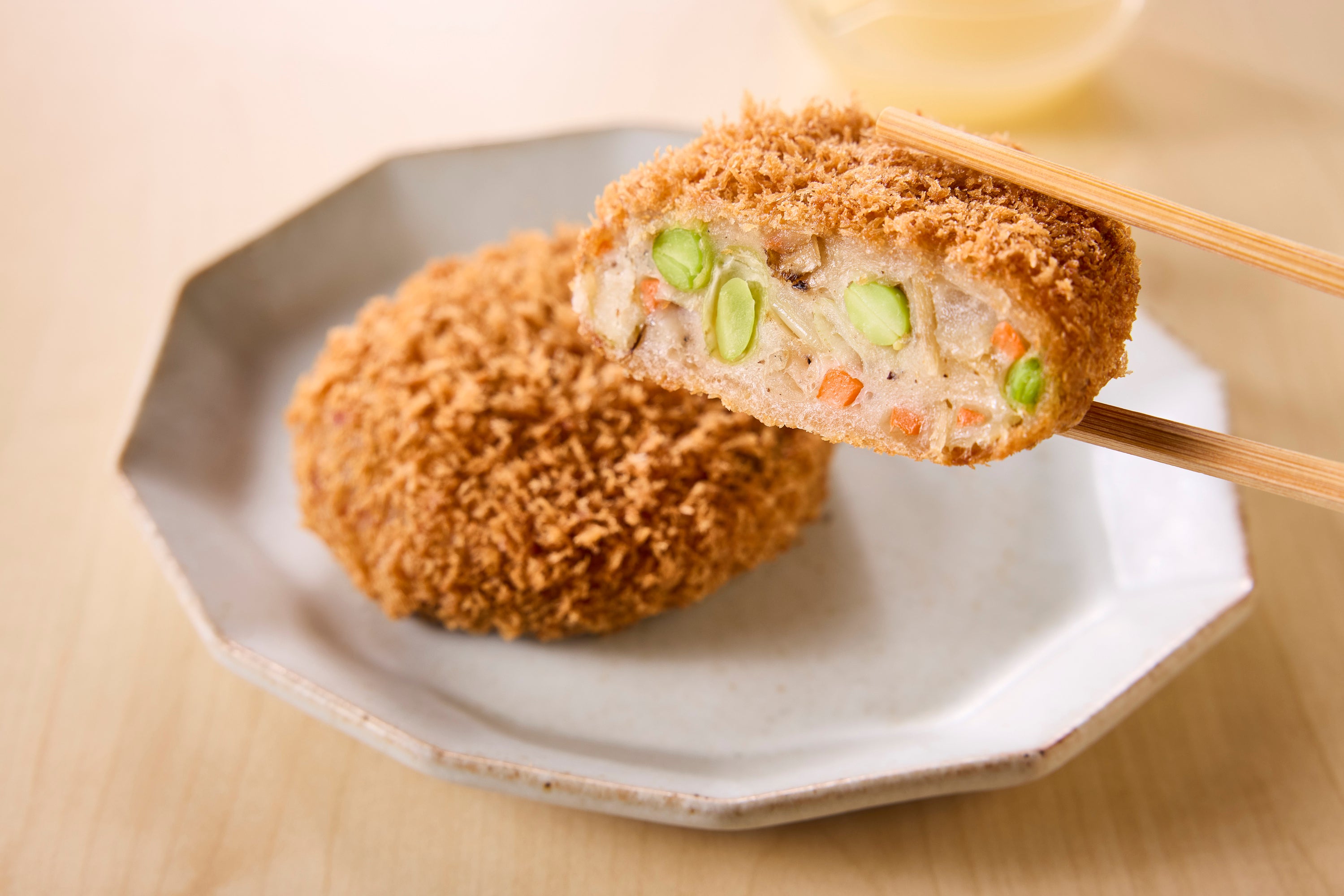 魚介類の不漁や価格高騰が続く中でも、「おいしい海の幸を届けたい」という想いから、愛媛県の郷土料理・じゃこ天をヒントにした商品を企画しました。魚介のすり身に、ごぼう・枝豆・玉ねぎ・人参など食感や彩りの良い野菜を合わせ、素材の旨みを活かしたふっくら軽やかなカツに仕上げています。