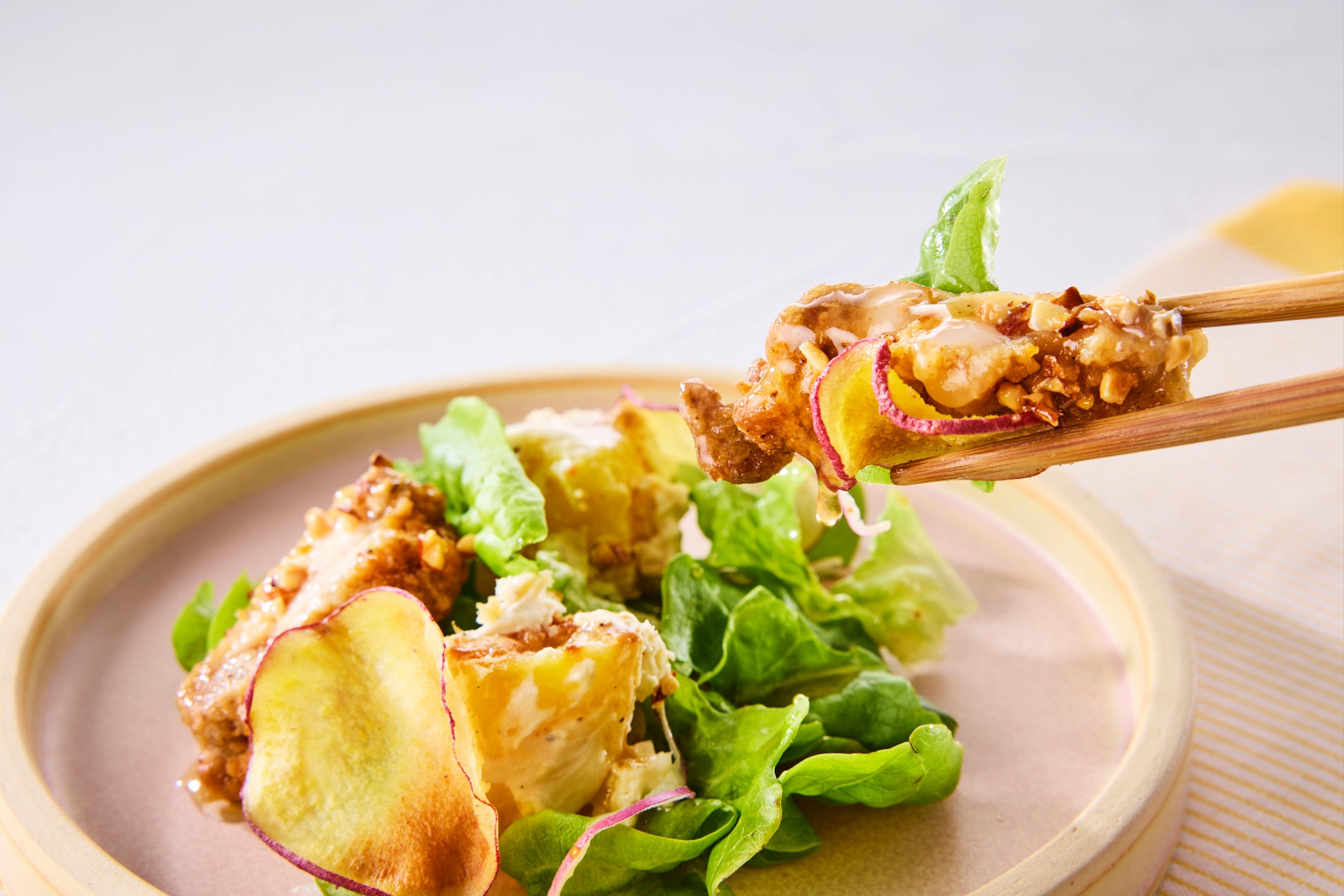 「さつまいもの魅力をより多くの方に伝えたい」という想いから、さつまいもが主役のサラダを考案しました。また、若い世代にもRF1のサラダの魅力を届けたいと考え、アメリカで親しまれている「ワッフルチキン」から着想。香ばしく焼き上げたチキンに、ねっとり食感のさつまいも、メープルシロップの甘さ、クリームチーズのコクを加え、やみつきになる味わいにしあげました。“ザクザク×ねっとり”の食感と、“甘さ×塩味”のバランスにこだわった一品です。