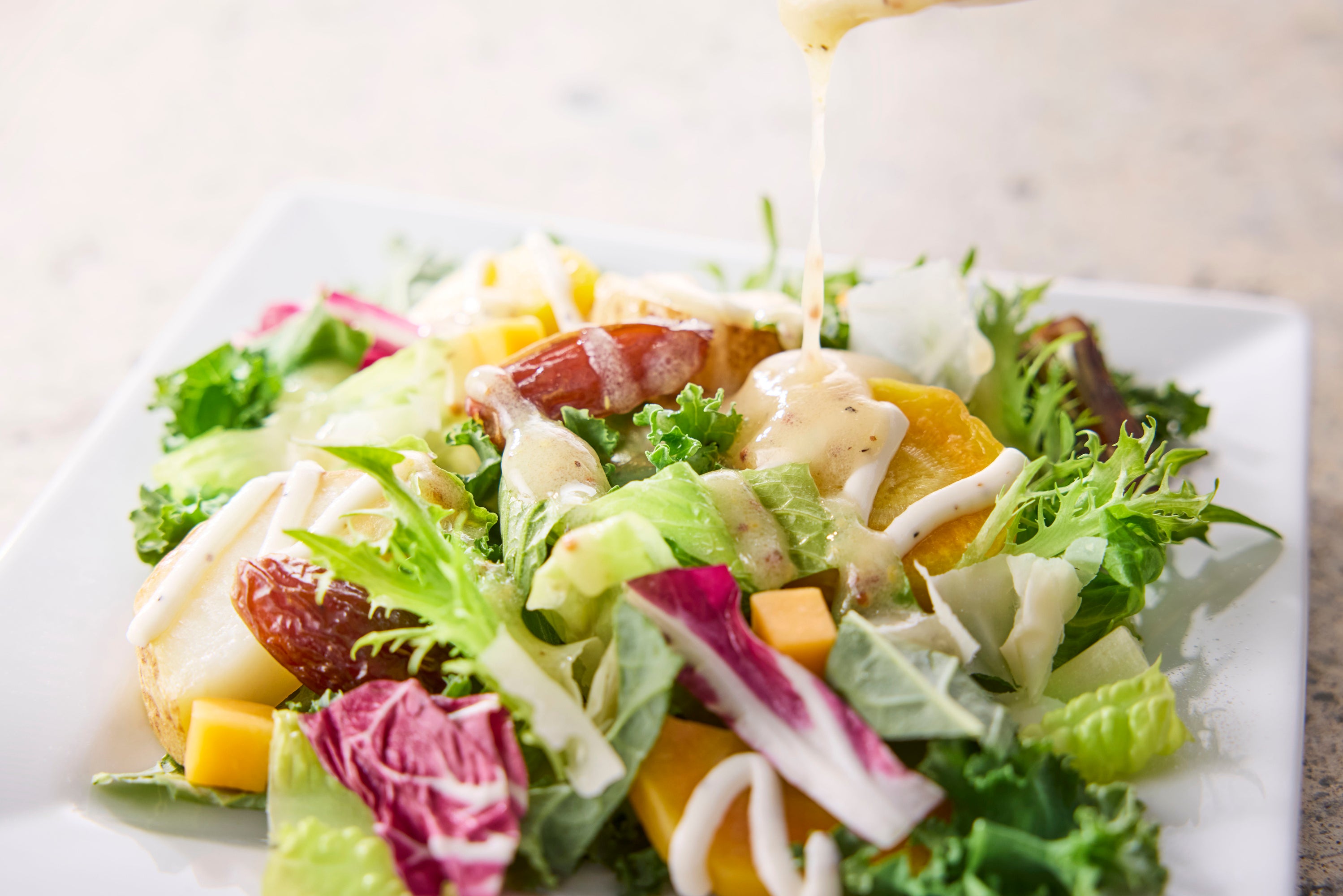 「楽しみながら健康になりたい」というお客様の声をもとに、優しい甘さのデーツを使用。日本の発酵食品である酒粕・白みそと、洋の発酵食品であるチーズを組み合わせたサラダを企画しました。クリームチーズに酒粕や牛乳を合わせたソースを加えることで、コクと香りをプラス。ドレッシングは、白みそをベースにレモン果汁やマスタードを加え、味噌の旨みを活かしながらもすっきりとした甘さに仕上げました。