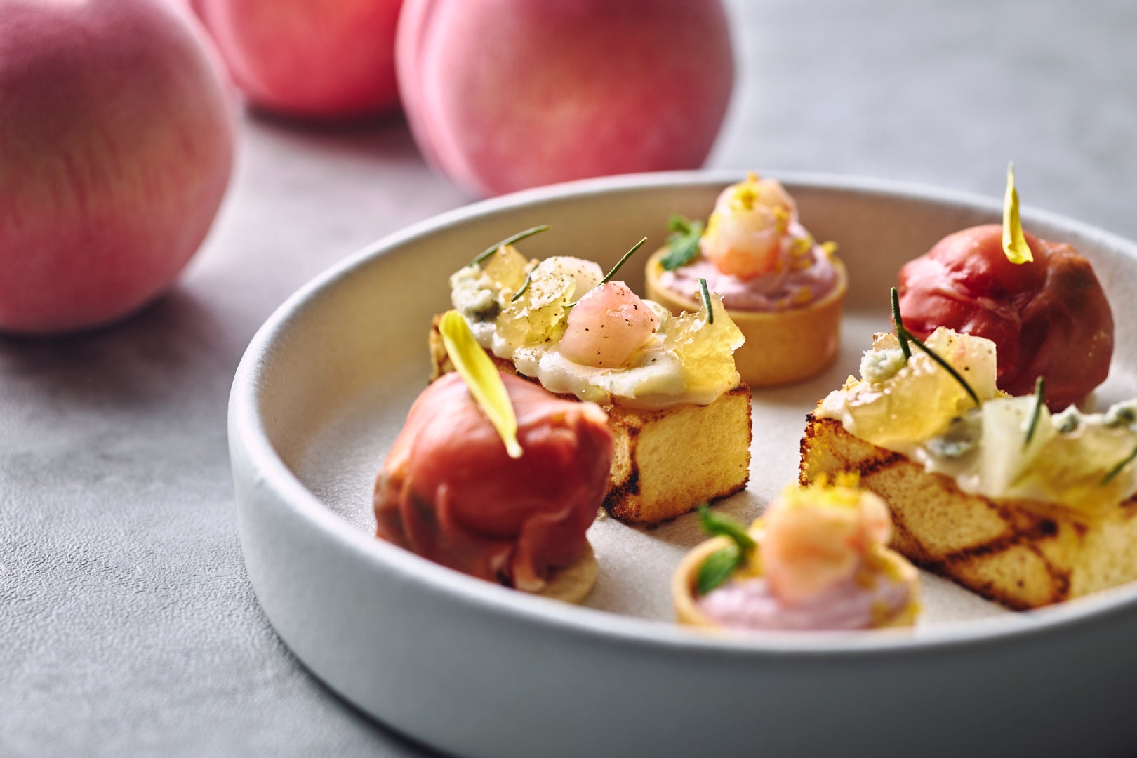 甘いスイーツに合わせてご堪能いただくのは、全3種のセイボリー。桃のやわらかな甘みと、チーズやハム、シーフードなどの塩味を組み合わせた、バランスの良いラインアップです。セラーノハムとマスカルポーネに桃を合わせた一品をはじめ、ゴルゴンゾーラと蜂蜜を組み合わせたブルスケッタ、生姜とほのかなレモンの風味が効いた爽やかな一皿など、異なる個性を持つメニューを揃えています。