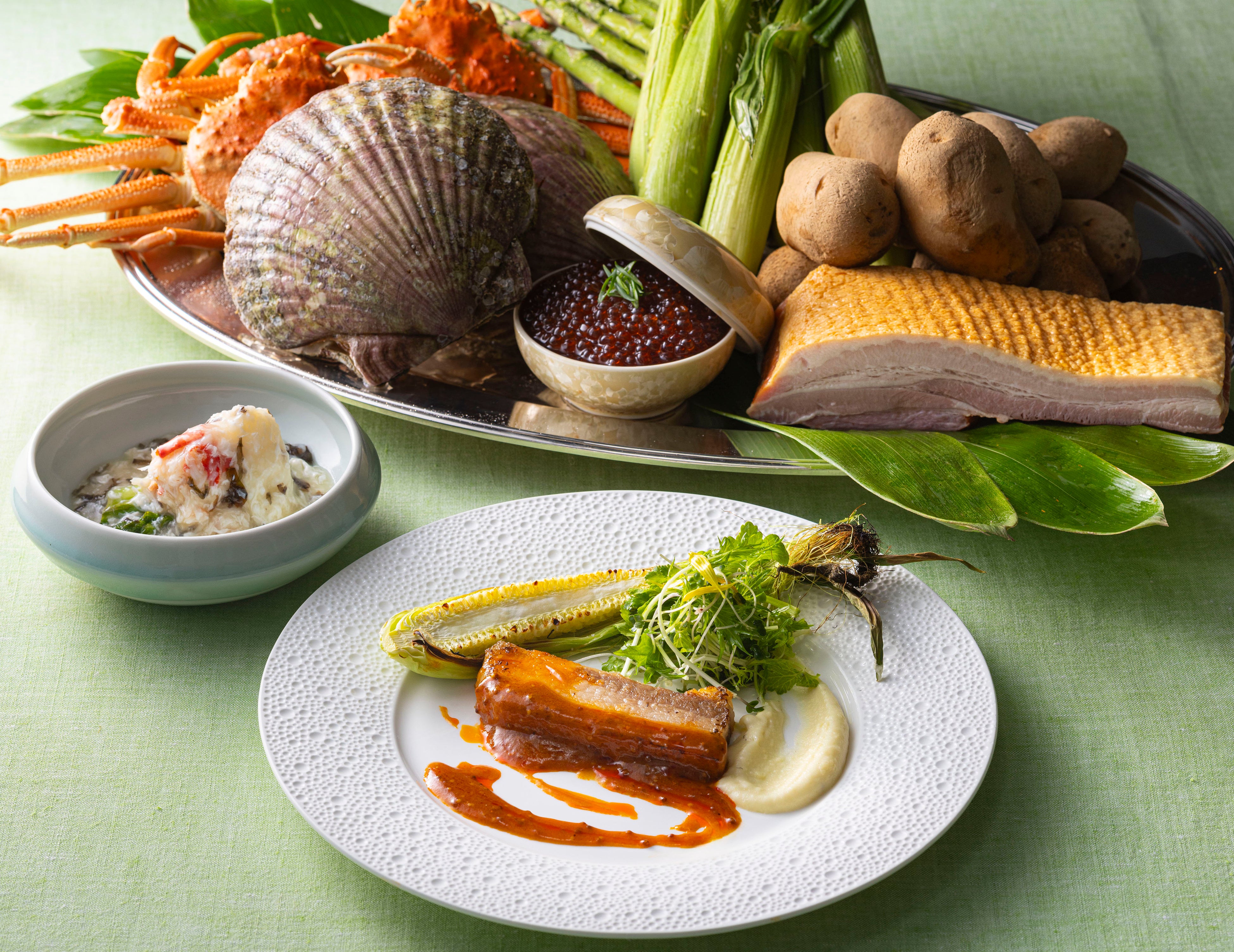アイヌの食文化をオマージュした前菜や、サクサクとした食感のたらば蟹のフリットをライスペーパーで包んで召し上がっていただくハルマキのほか、メロンをふんだんに使用した贅沢なパフェなど、前菜からデザートに至るまで北海道の食の恵みを存分にお楽しみいただけます。