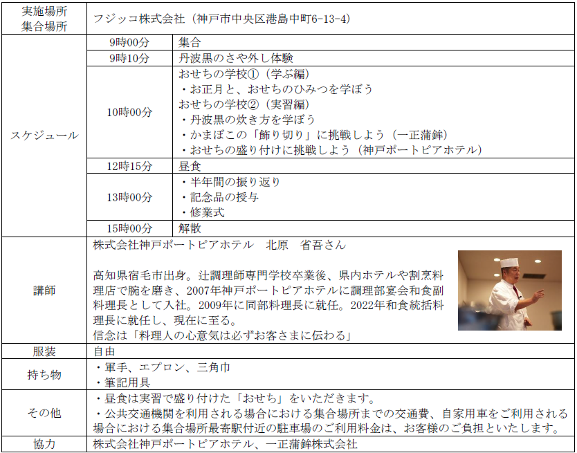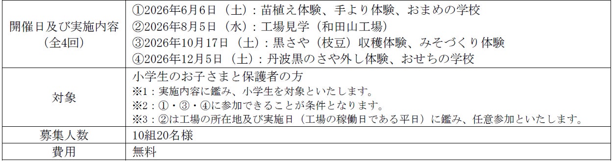 フジッコ株式会社(本社:神戸市中央区/代表取締役社長執行役員:福井正一)は、丹波黒の苗植えから収穫までの農業体験と、日本の文化やおせち料理を学ぶ会をセットにした全4回の「丹波黒育成体験プログラム」を、株式会社小田垣商店、株式会社神戸ポートピアホテル、一正蒲鉾株式会社のご協力を得て開催いたします。
