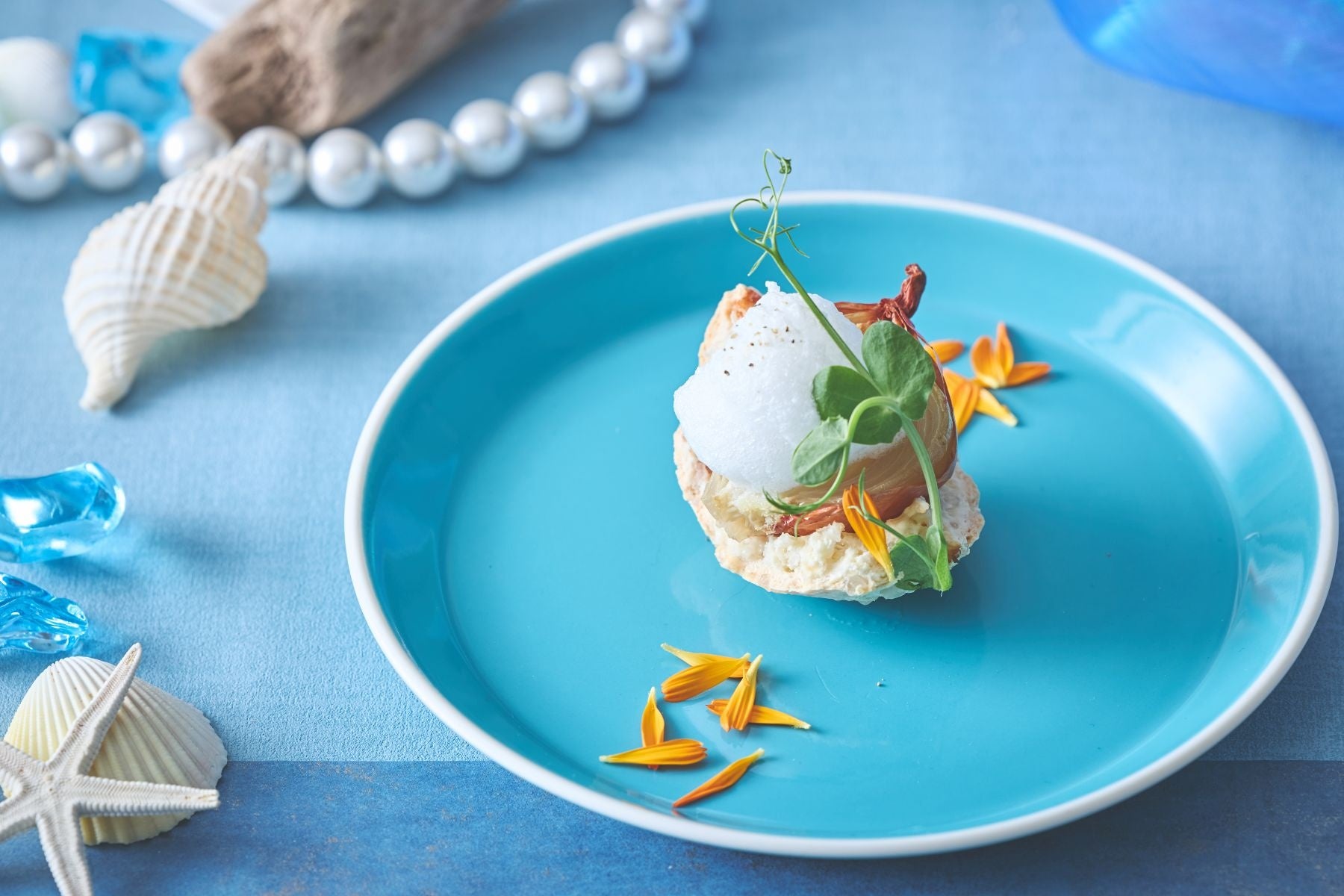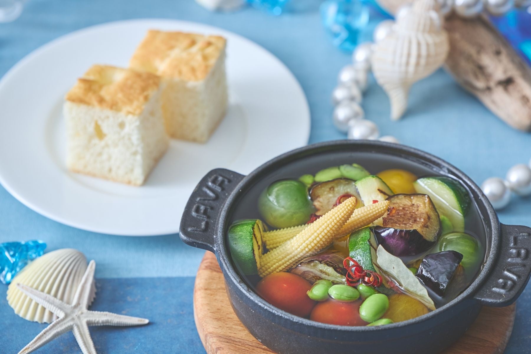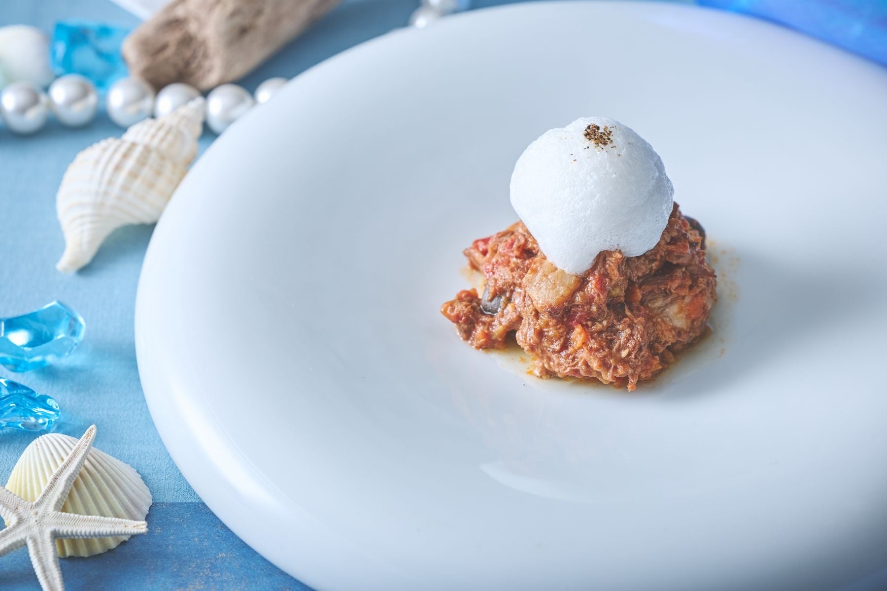 コース料理は「玉葱の岩塩包み焼き」から始まり、爽やかなオレンジが香るキャロットラぺ、モッツァレラチーズを忍ばせたあおさ海苔のゼッポリーニ、食感の楽しいイカ墨そうめんフリットなどの「アンティパストミスト(前菜5種類の盛り合わせ)」、自家製のフォカッチャと共に楽しめる彩り鮮やかな「夏野菜のアヒージョ」、メイン料理はイタリア産トマトで柔らかく煮込んだ牛肉に昆布の隠し味が深いコクと旨味を引き出す「イタリアトマトの牛肉ブレゼ」、貝殻の形のショートパスタ「コンキリエ」を使用した「タスマニアサーモンのレモンクリームパスタ」、コース料理の締めくくりには澄み渡る青い海をイメージし、ホワイトチョコの甘みとクリームチーズの爽やかさが調和した、目にも涼やかなデザート「マーレ ブルー」をご用意いたしました。