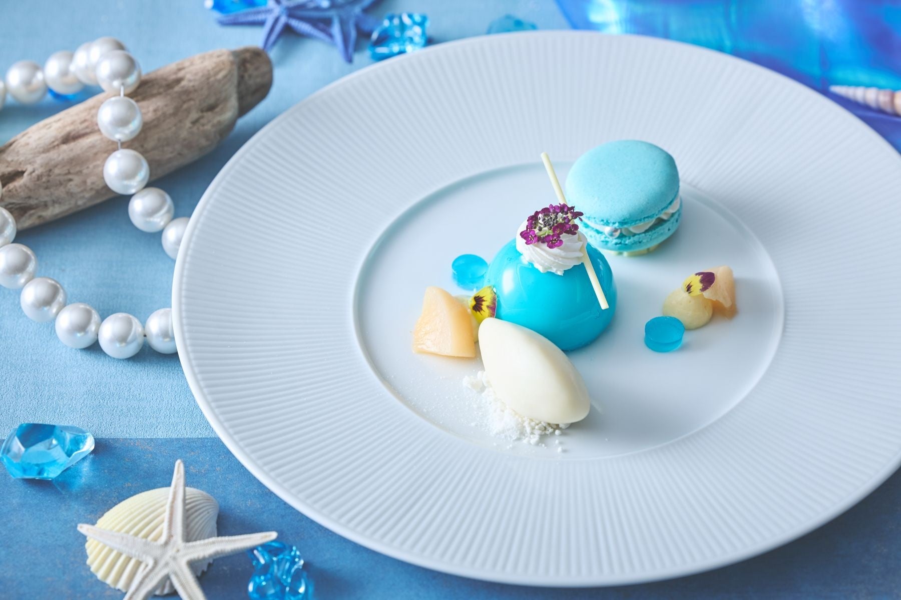 ・デザート「マーレ ブルー」(ホワイトチョコレートのムース、バニラマカロン、クリームチーズのアイスクリーム)