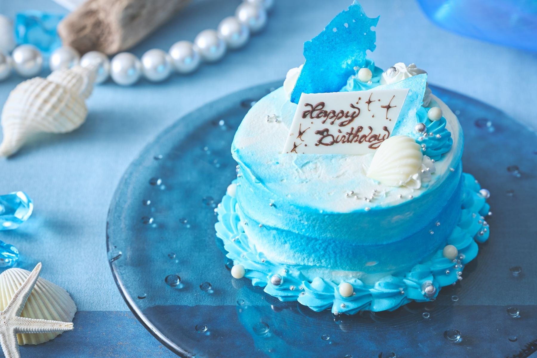 波を連想させる美しいグラデーションに、貝殻・パール・飴細工のデコレーションが施された苺のショートケーキ。