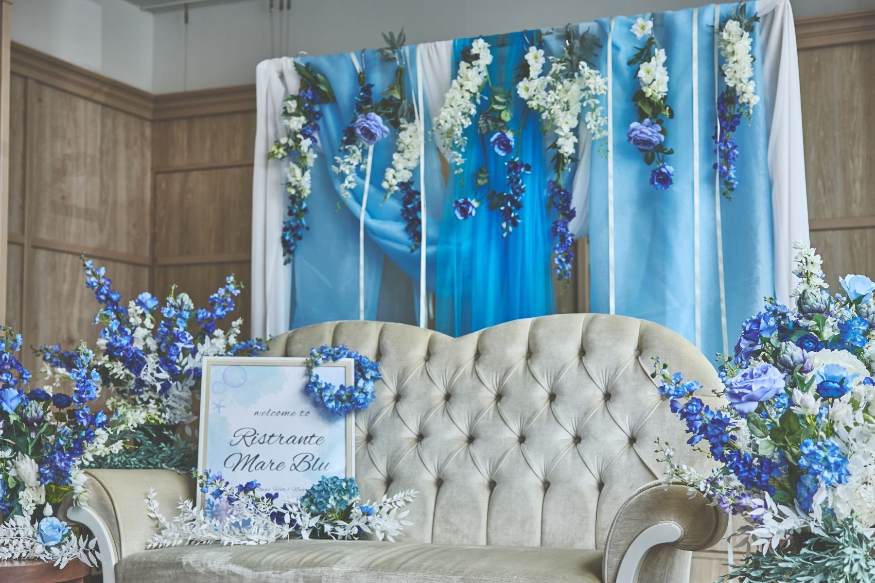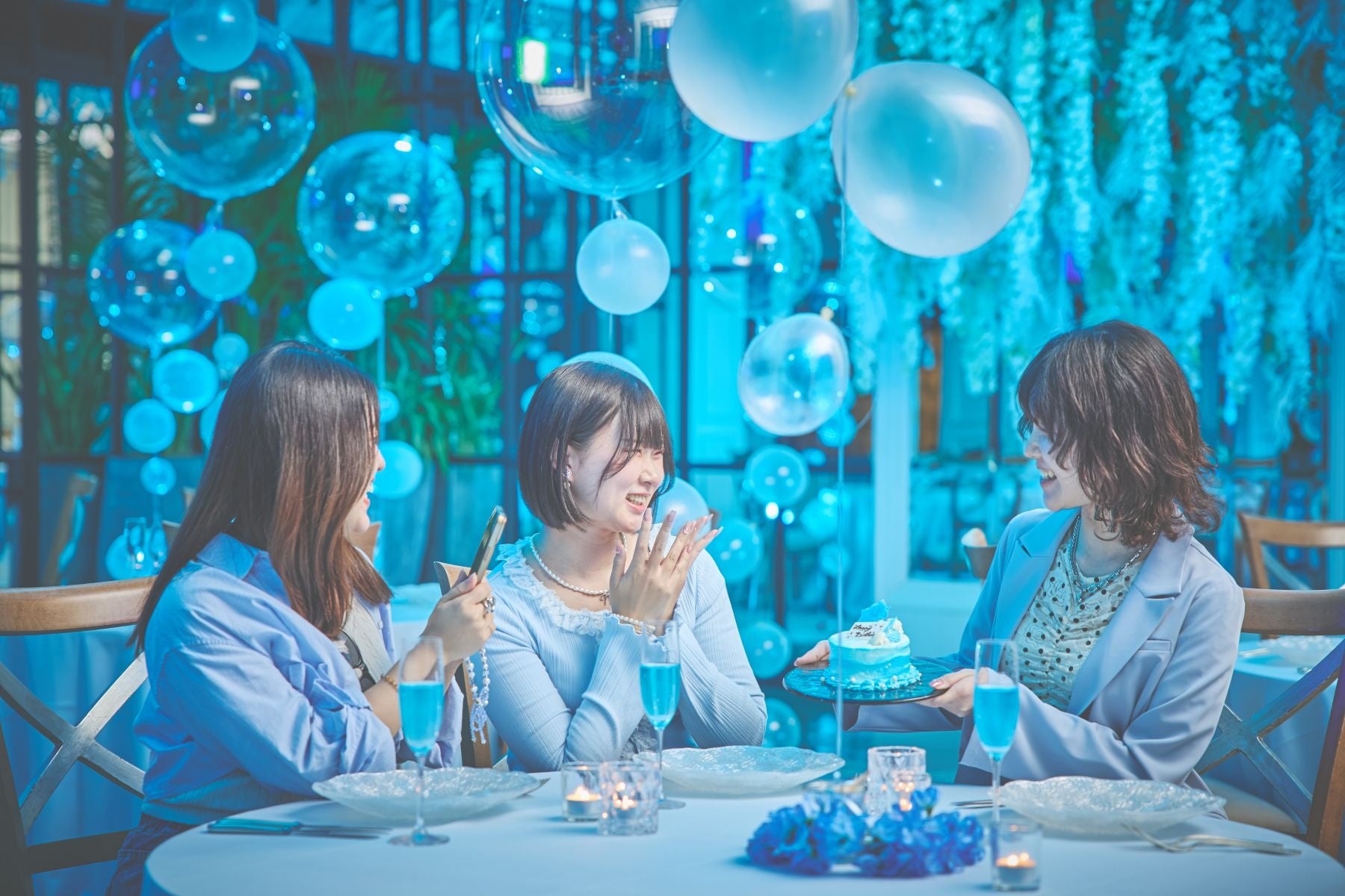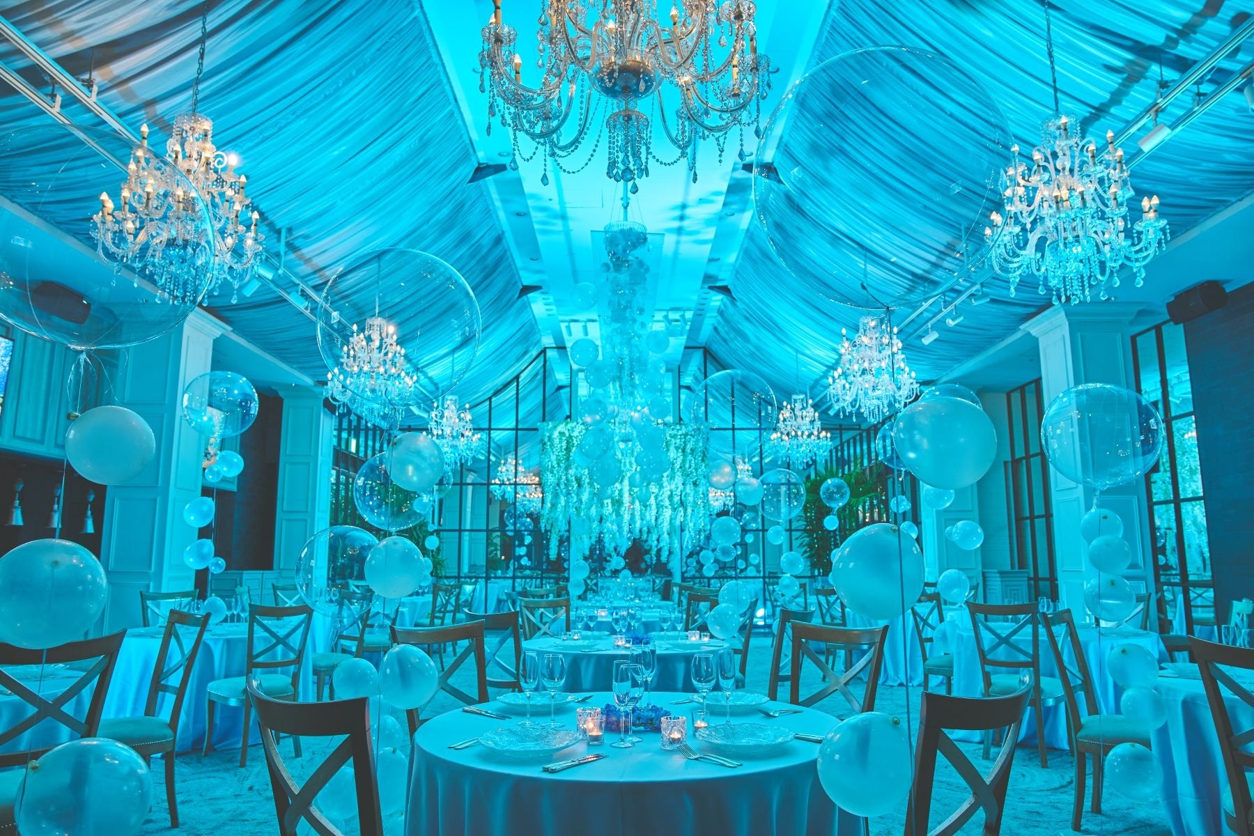 会場内は青く染められた幻想的な美しい空間と泡を連想させるバルーンデコレーションを施し、まるで海の中にいるかのような没入感と神秘的な世界観をお楽しみいただけます。