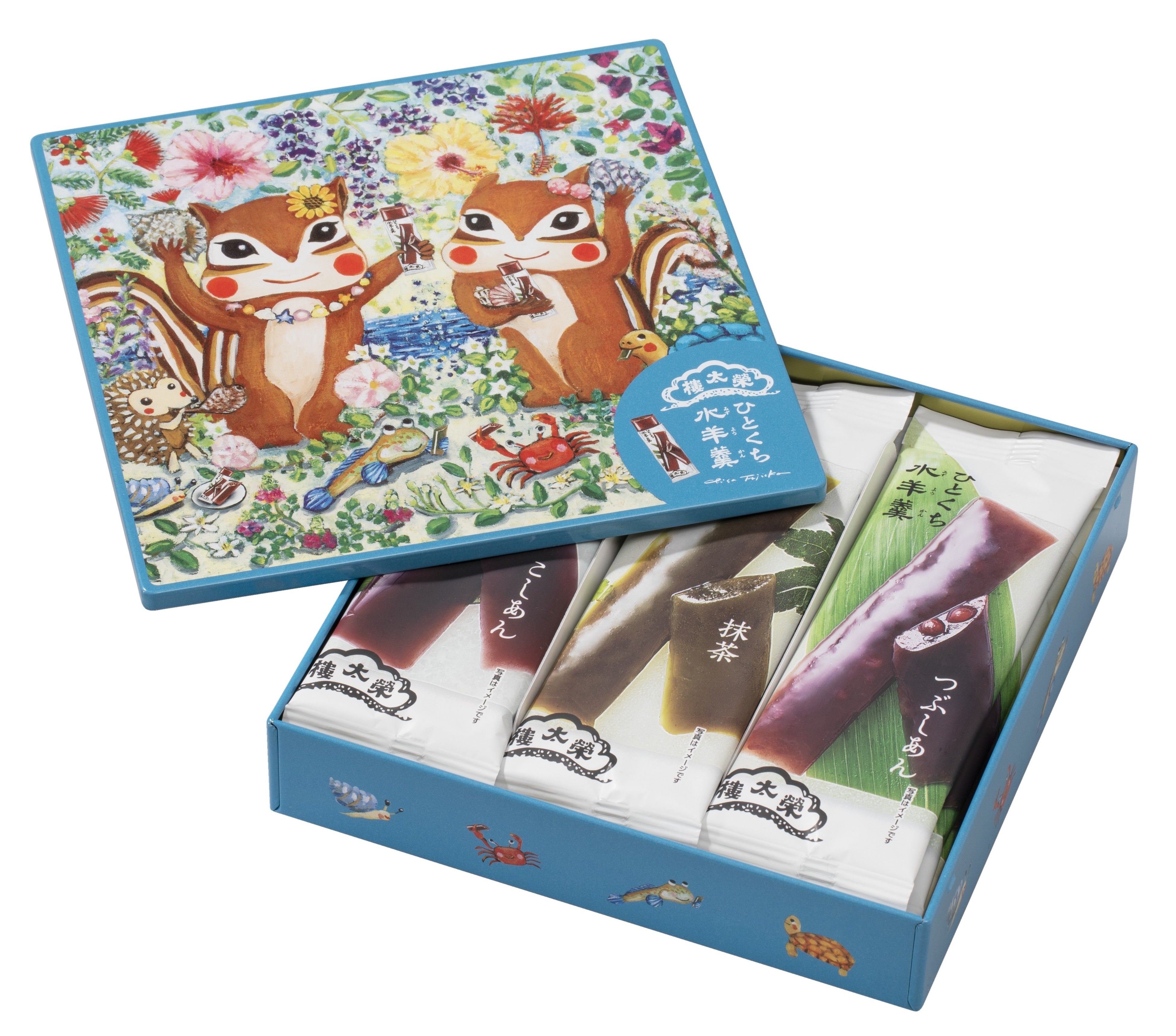 南の国の花が風に揺れる海辺で、リスたちがカメの親子やムツゴロウなどゆかいな動物たちと一緒に遊びながら水羊羹を食べている様子を描いた、藤岡ちささんデザインの可愛らしい缶入のひとくち水羊羹です。