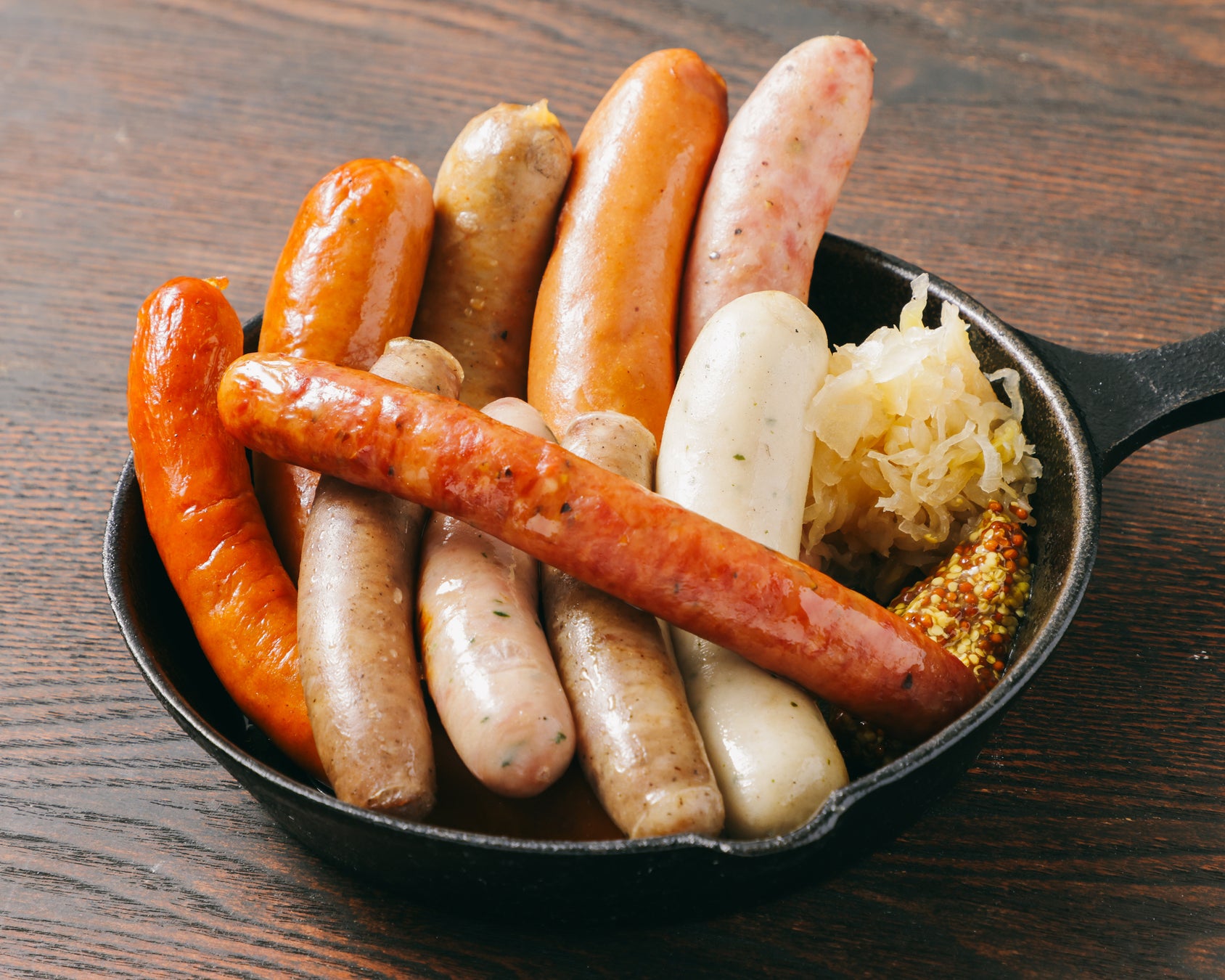 単品は380円(税込 418円)から楽しめるほか、<辛>ソーセージセット、ジビエソーセージセットなどのお得なセット盛りもご用意しております。全10種盛り合わせもございます。