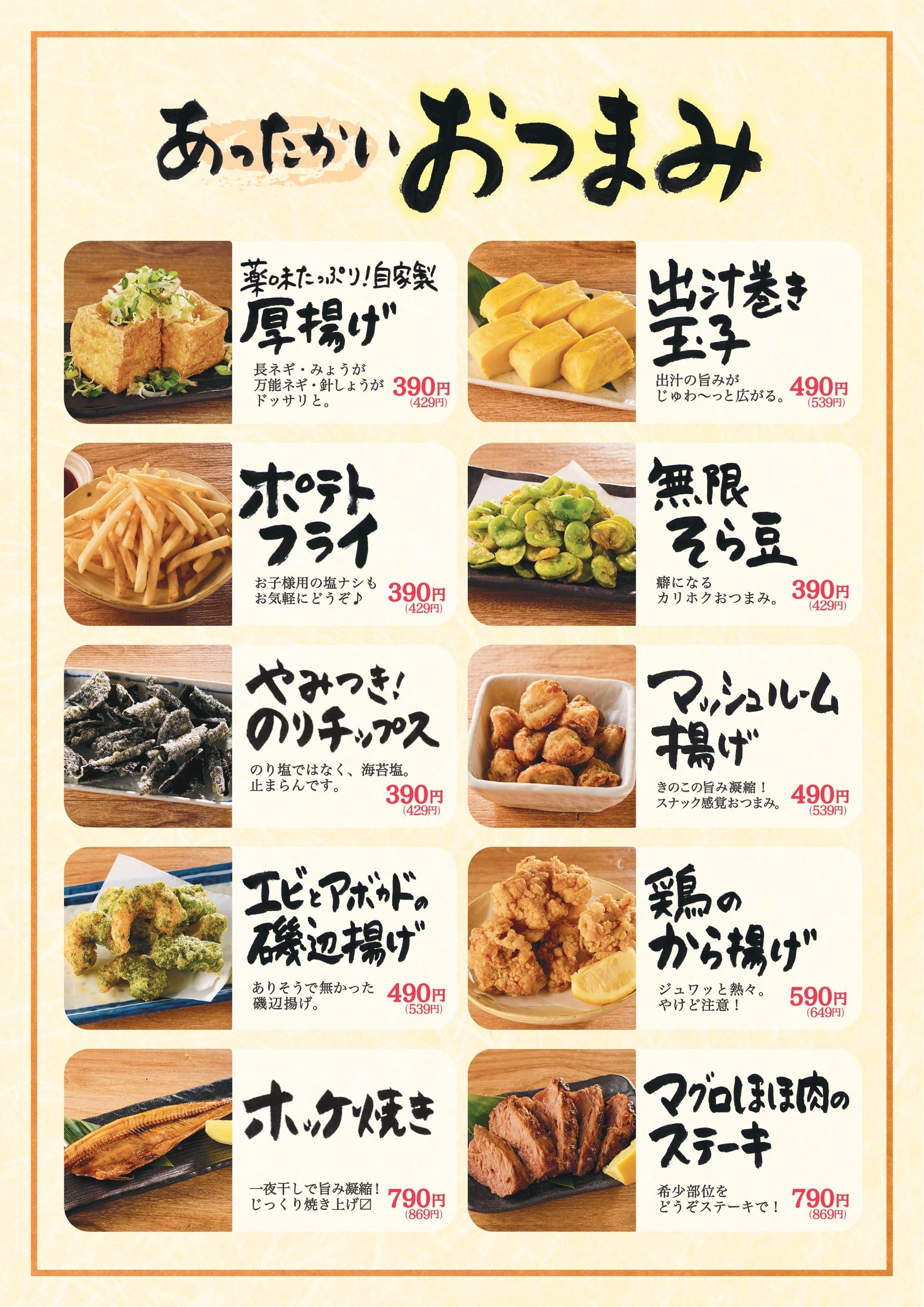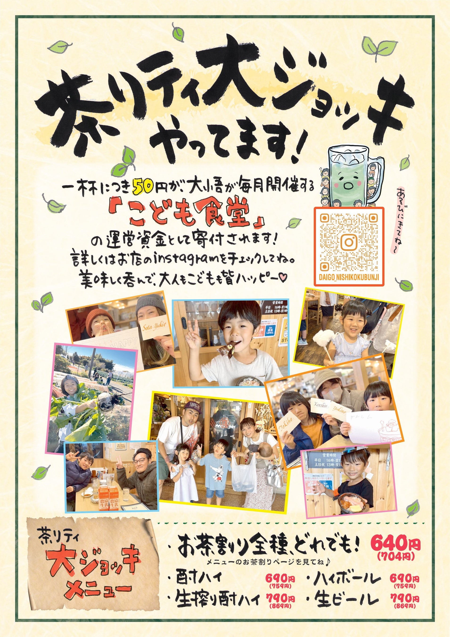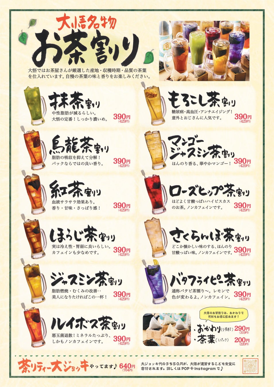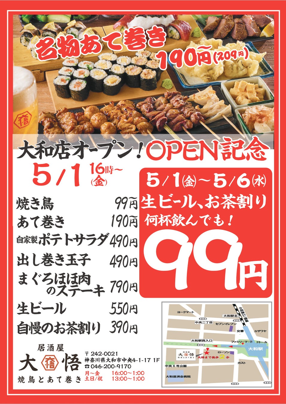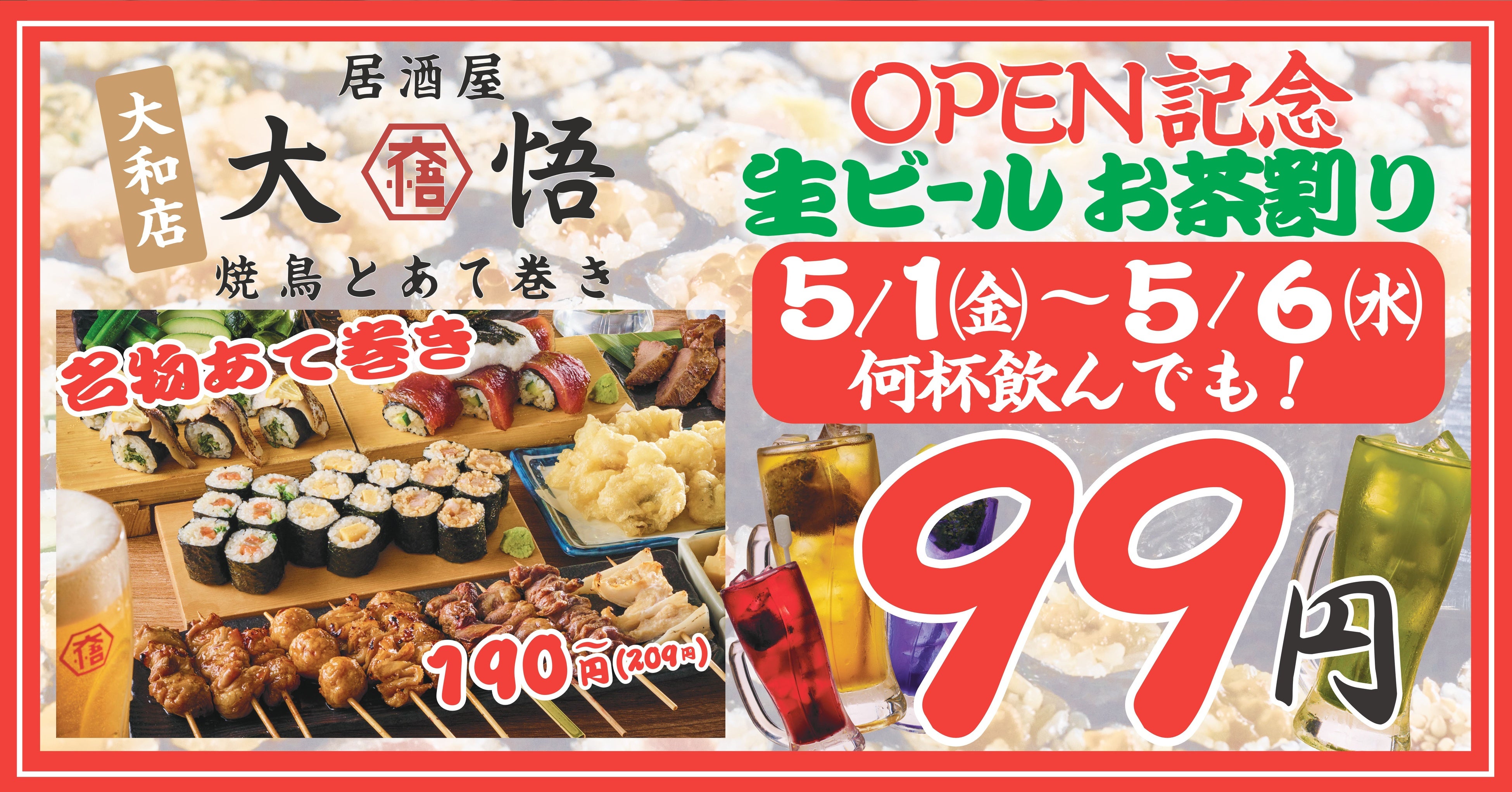 オープンを記念して5月1日~6日までの6日間は生ビールorお茶ハイを何杯飲んでも99円(税込み108円)でご提供!
