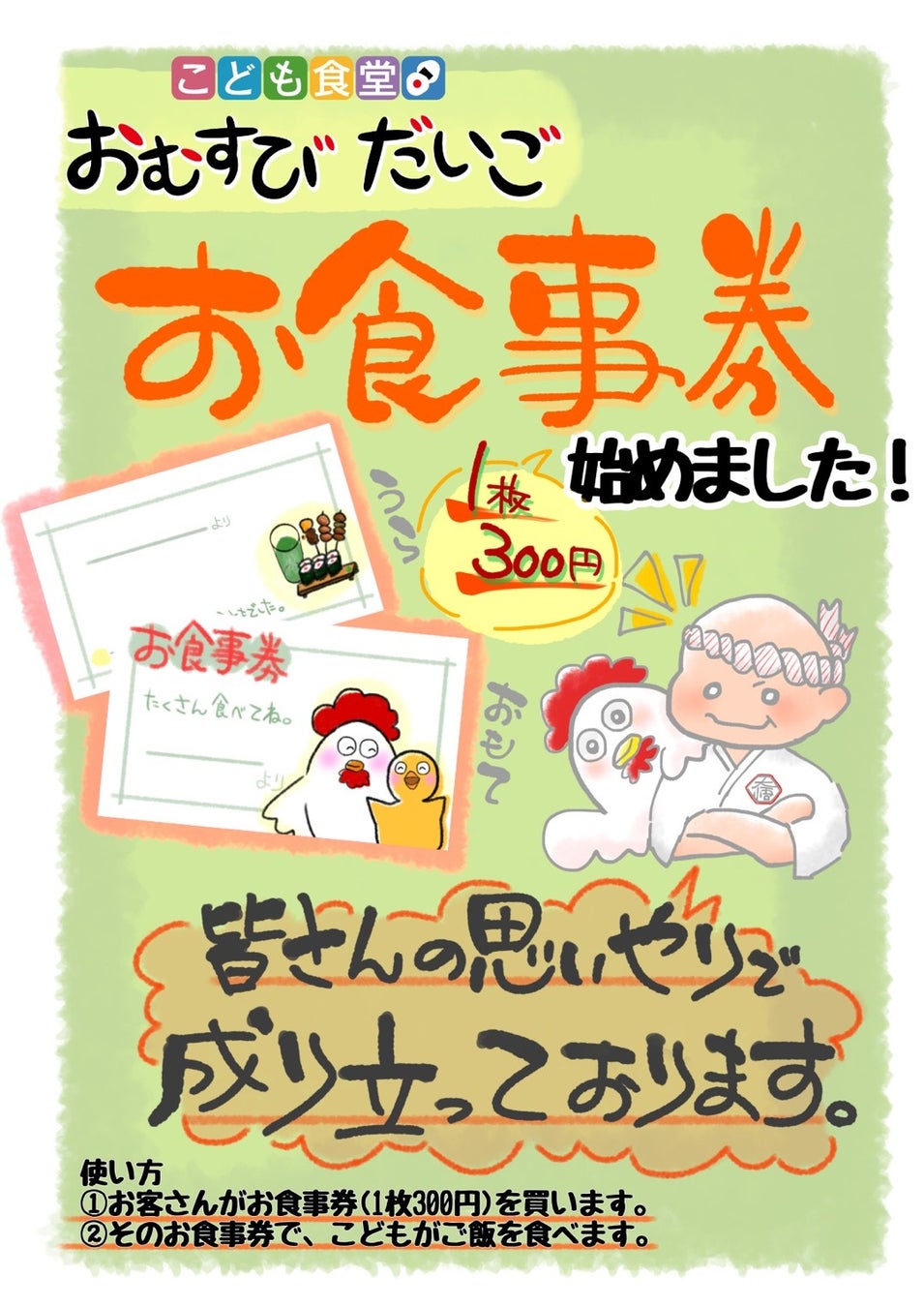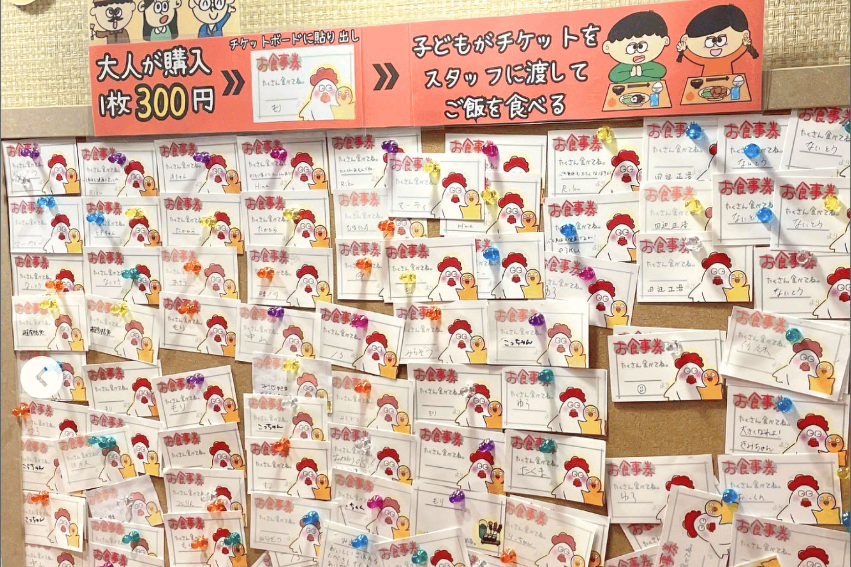 その根底にあるのは、「人を育み、世の中に貢献する」という思いです。居酒屋大悟は飲食店の枠にとどまらず、地域貢献活動にも積極的に取り組んでいます。なかでも「こどもお食事券」は、その姿勢を体現する取り組みです。来店したお客様が300円でチケットを購入し、メッセージを添えて店内に掲示すると、地域の子どもたちが自由にそのチケットを使って定食を食べることができます。お店を起点に、地域の人々が自然と支え合う循環が生まれています。