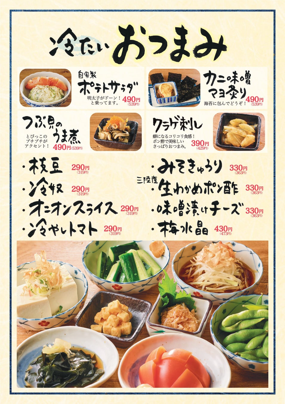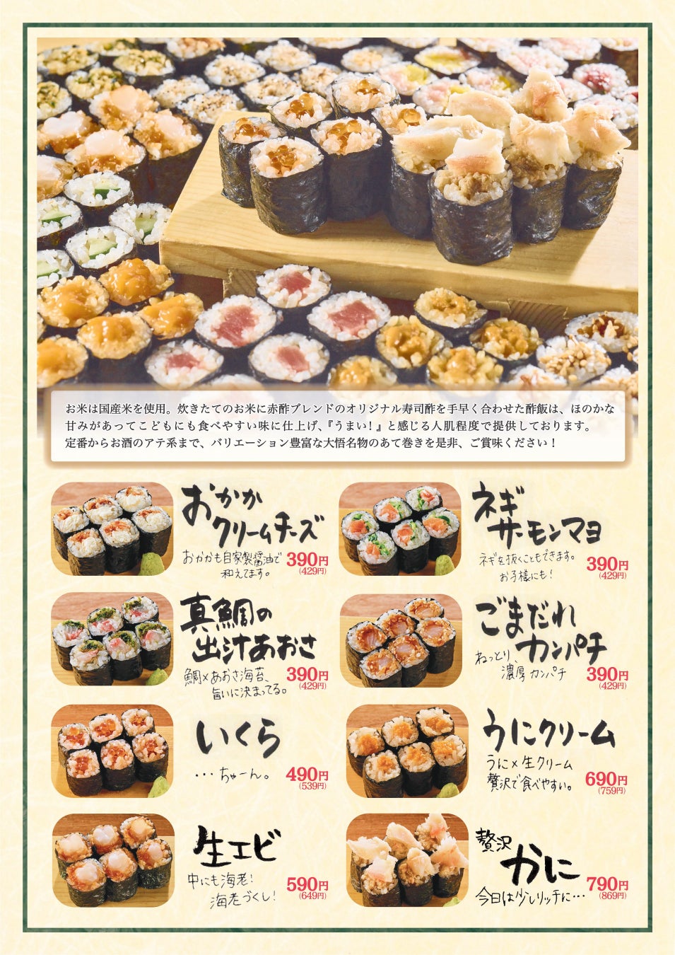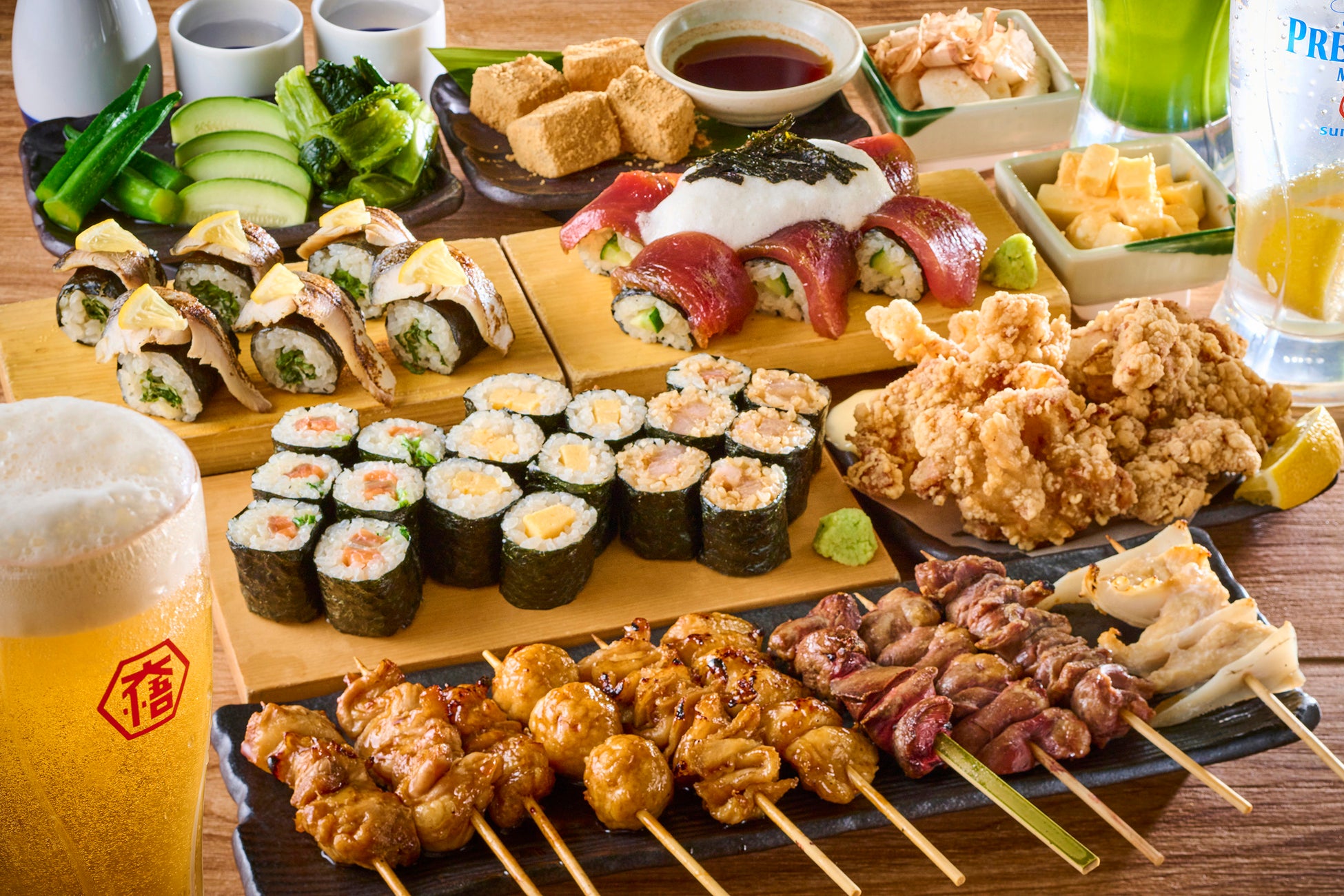 名物でもある新鮮な国産鶏の串焼き(1本税抜き99円~)と、お酒の「あて」にもなる種類豊富な細巻き寿司(税抜き190円~)を中心に、こだわりの手作りおかずと、10種類以上のお茶割りや居酒屋の鉄板メニューをリーズナブルにお楽しみいただけます。