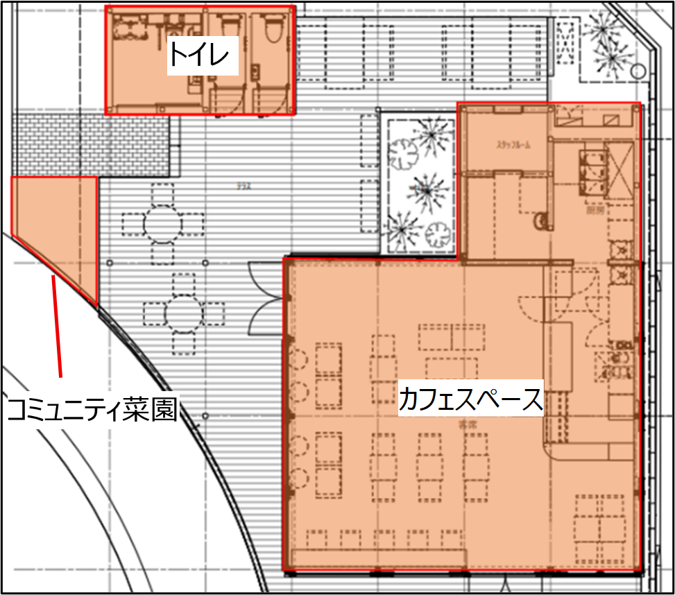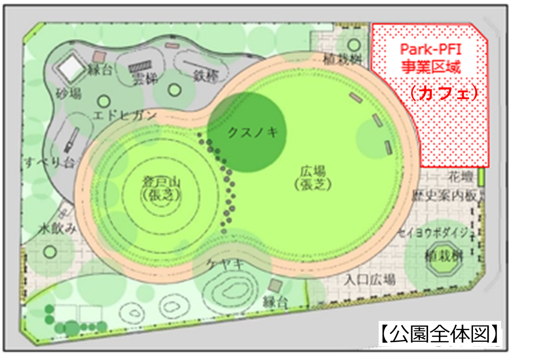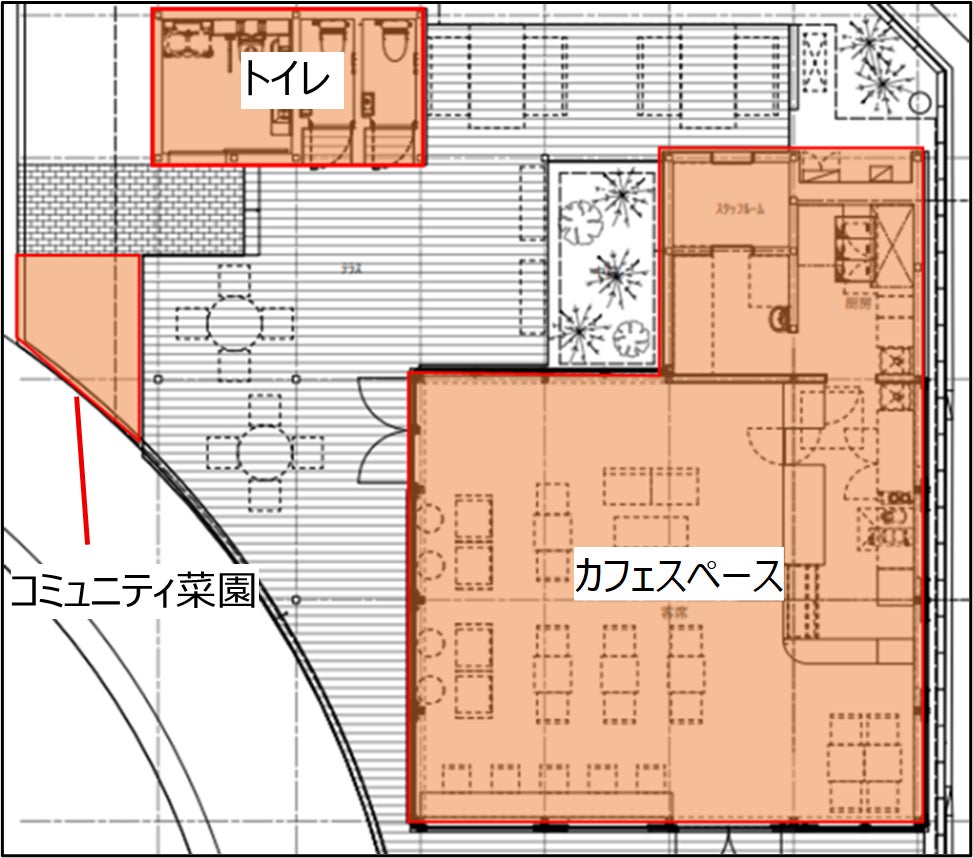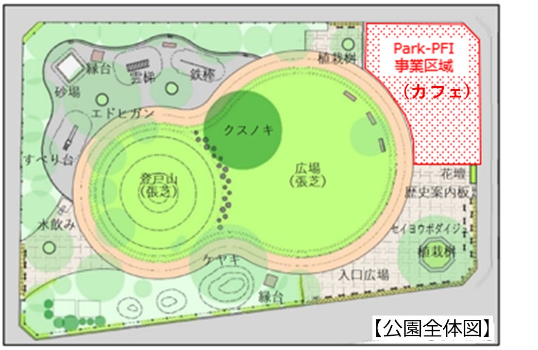 Park-PFI事業区域内にできるカフェは国産木材を活用し建設され、公園利用者が利用できる男女別の洋式トイレ及びバリアフリートイレや地域の方々と協力して野菜や草花を育てることができるコミュニティ菜園が設置されます。