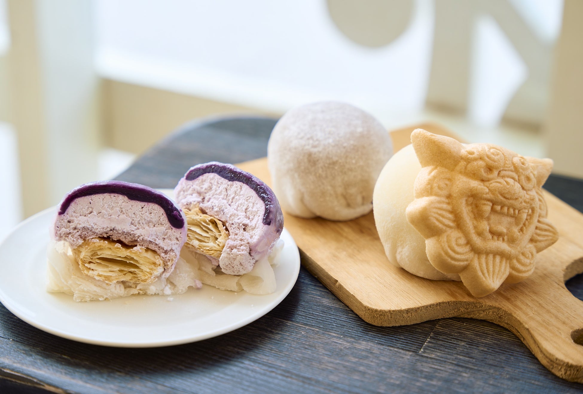 紅芋あんに紅芋クリーム、さらにパイも入れて求肥で包んだ大福。シーサー型の最中で挟むと、より沢山の食感を楽しめます。