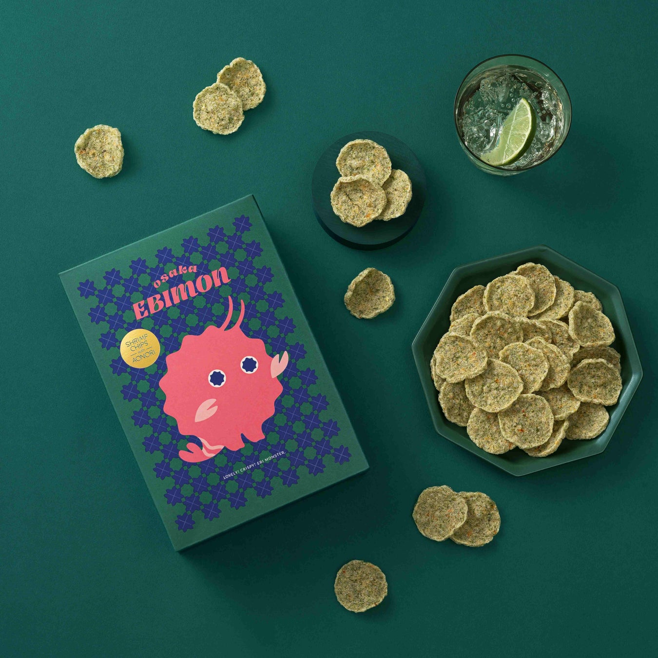 製品特徴:天然海老に国産青のりの風味ふわり、カリッとサクッと揚げて軽やか、たまらないもんEBIMON。