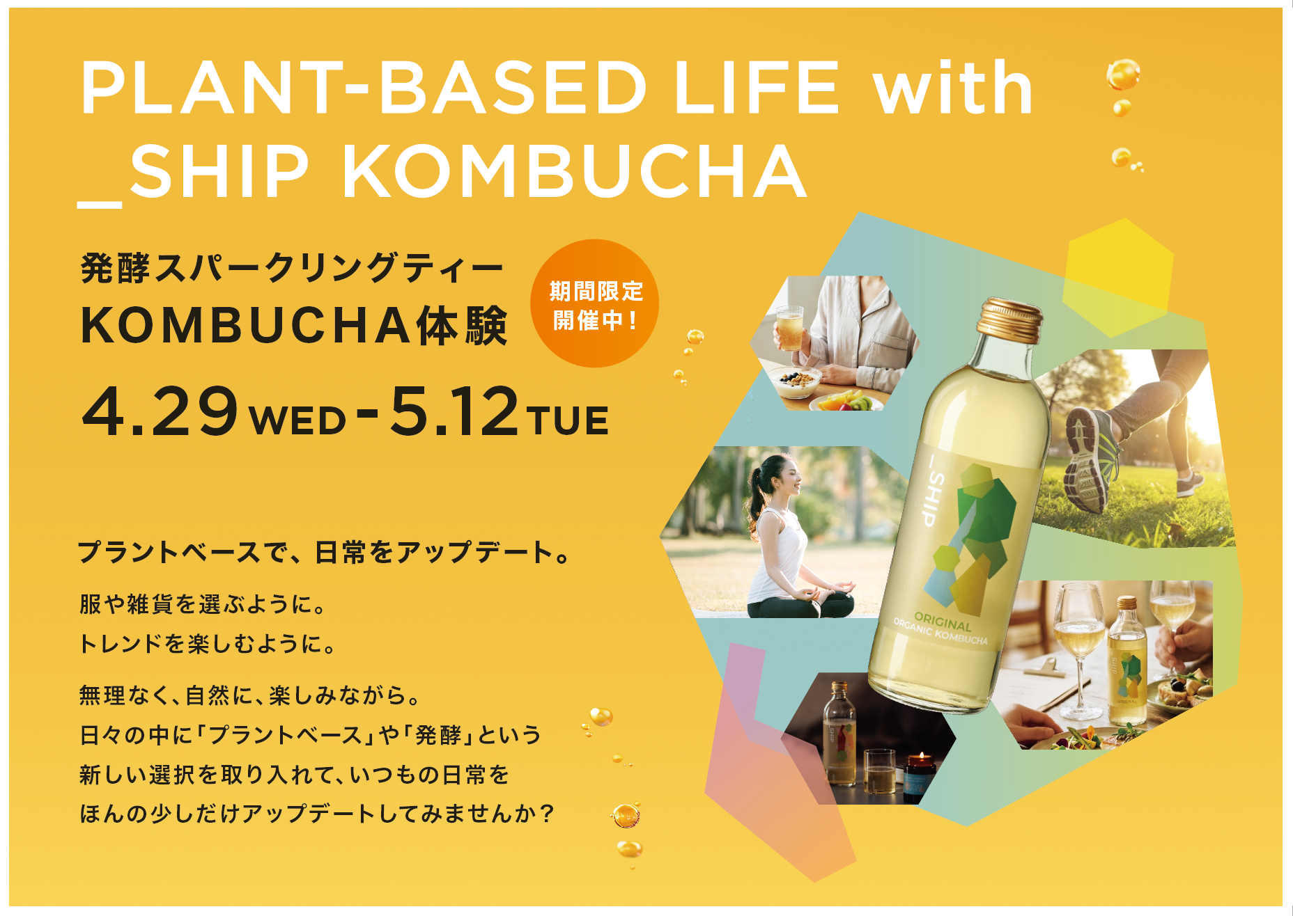 4月29日(水)〜5月12日(火)「PLANT-BASED LIFE with _SHIP KOMBUCHA」をテーマに、ボトル販売や飲み比べセット、発酵スムージーなどを販売。