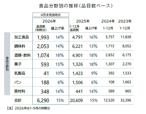 主要な食品メーカー195社における、家庭用を中心とした2026年の値上げは、1~9月までの累計で6290品目となった。年間の値上げ品目予定が1万品目を超えていた前年同時期(2025年4月調査時、1万4409品目)に比べ、2026年4月調査時では予定を含め、前年比6割減ペースでの推移となった。