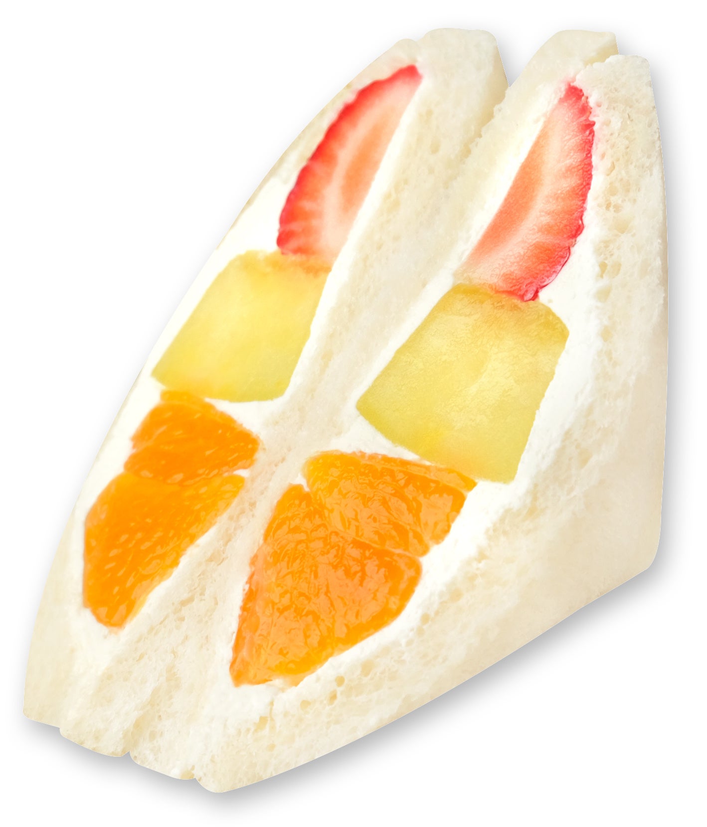 甘酸っぱいいちご、みずみずしいパイン、やさしい甘さの黄桃を彩りよくサンドした、春限定のミックスフルーツサンド。ひと口ごとに爽やかな甘みとほどよい酸味が広がります。春らしい華やかな断面とともに、季節の味わいを楽しめる一品です。