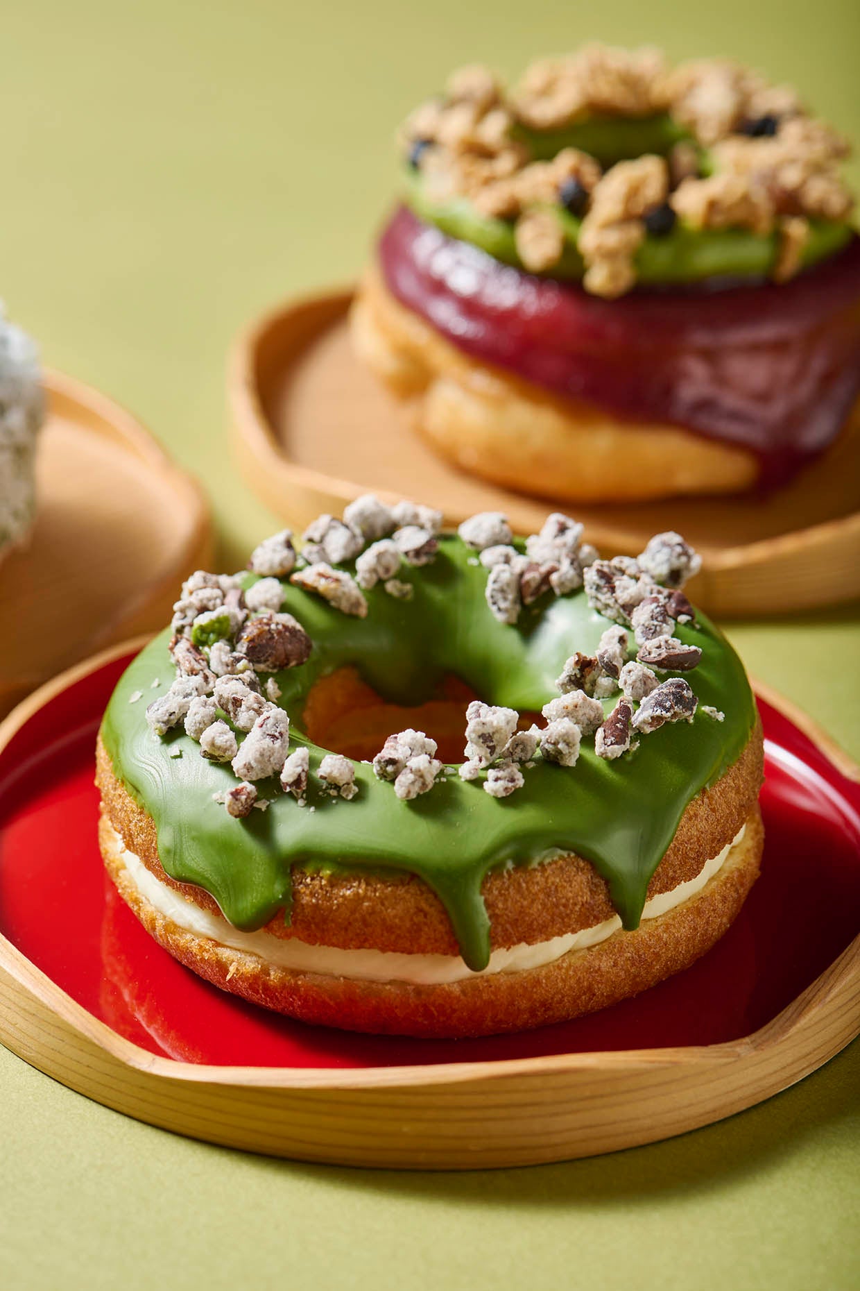 ラインアップは、「アサイー抹茶」「抹茶ホワイトチョコレート」「抹茶ラミントン」の3種。アサイーピューレのグレーズをまとったドーナツに抹茶バタークリームを絞り、グラノーラやドライブルーベリーをトッピングした「アサイー抹茶」。抹茶チョコレートでコーティングしたもちもち食感のドーナツに、カカオニブをトッピングし、ホワイトチョコレートクリームをサンドした「抹茶ホワイトチョコレート」。抹茶グレーズとココナッツをまとうドーナツに、抹茶バタークリームやフリーズドライいちご、自家製いちごジャムを合わせた「抹茶ラミントン」。アサイーやココナッツ、カカオなどのナチュラル素材を抹茶と掛け合わせ、これまでにない味わいの抹茶ドーナツに仕上げました。