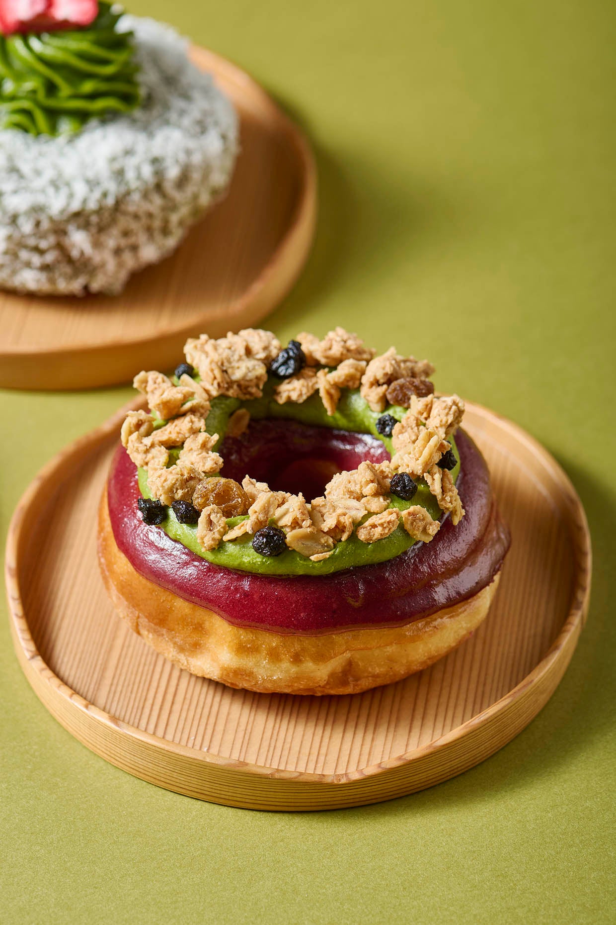 アサイーピューレのグレーズをまとったドーナツの上に、プラントベースの抹茶バタークリームを絞りました。