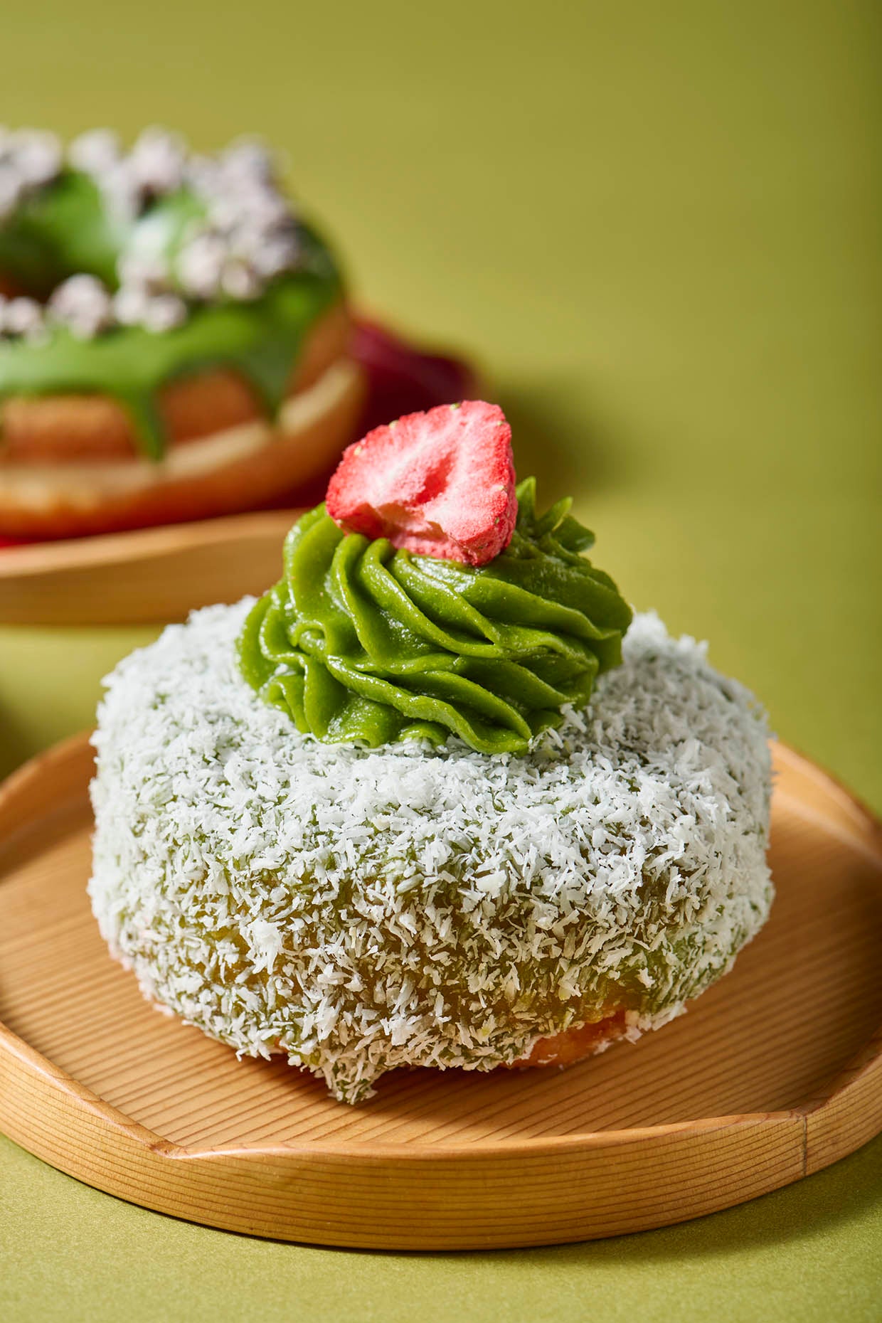 ふわふわのイーストドーナツ生地に、抹茶グレーズとココナッツをまとわせたラミントン風ドーナツ。抹茶バタークリームとフリーズドライいちごをトッピングし、中に入った自家製いちごジャムの程よい酸味と、ココナッツの風味と抹茶の香りが相性の良い一品です。