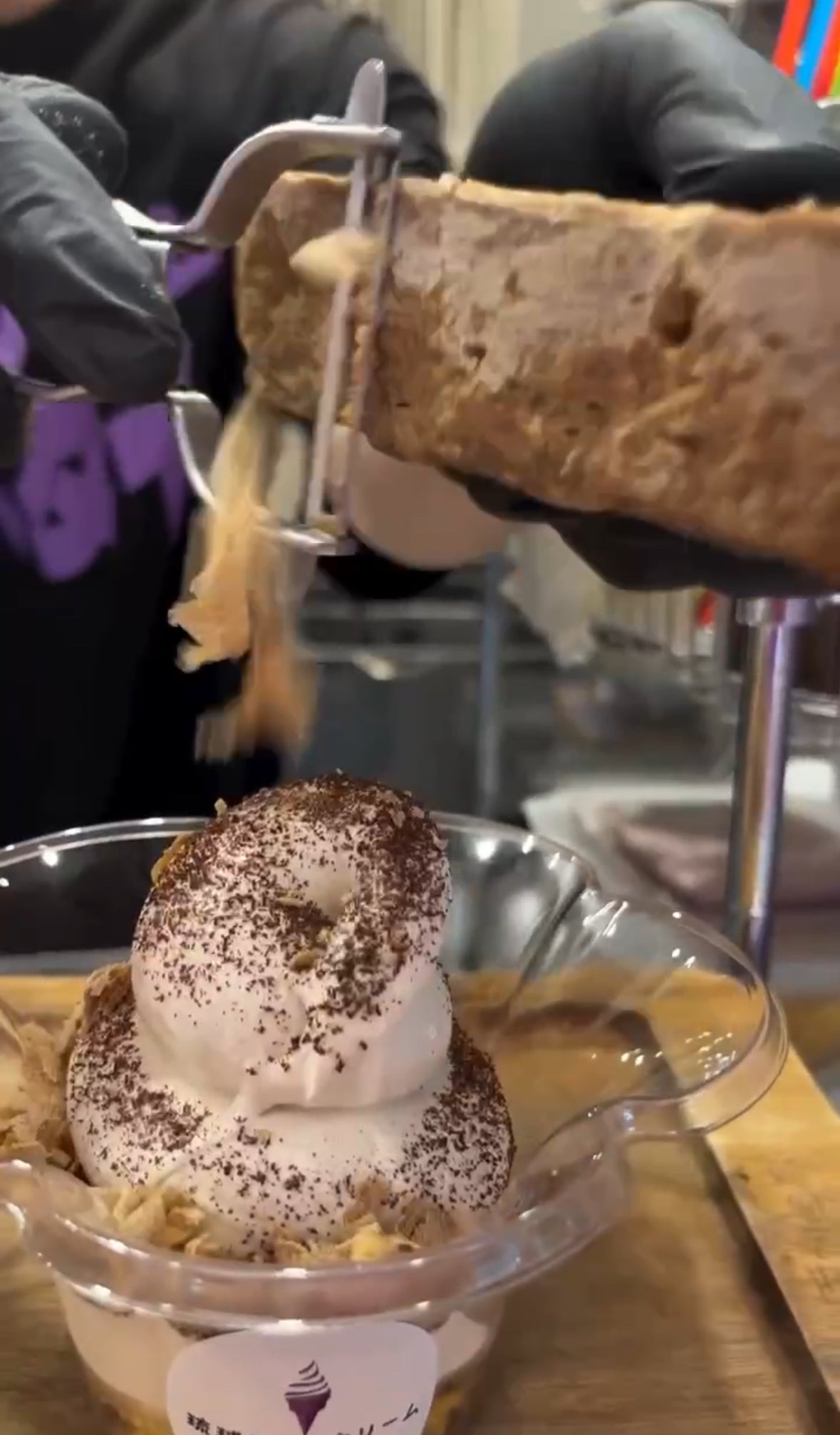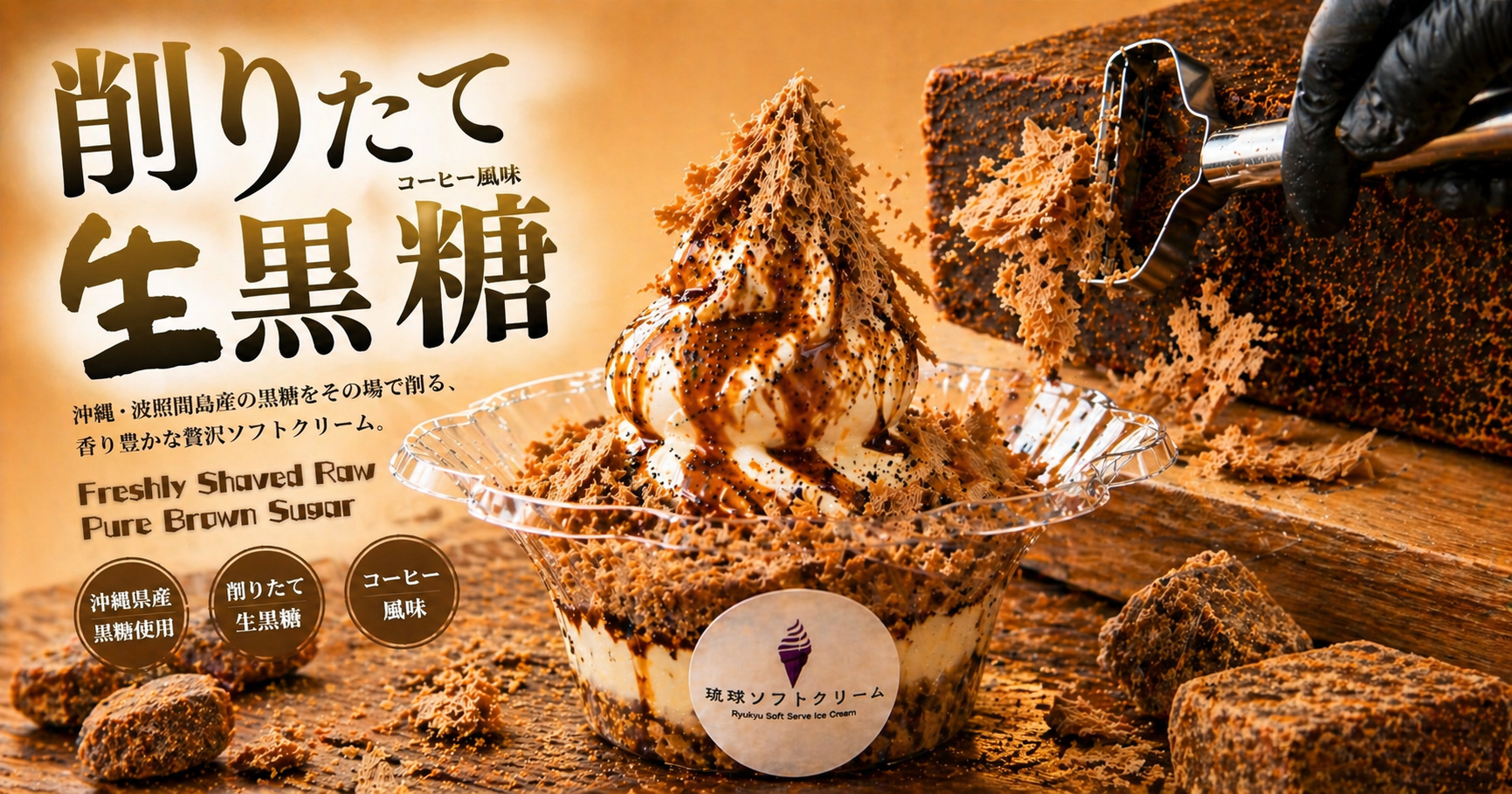 本商品は、1975年創業の老舗黒糖製造卸 合資会社共栄社(沖縄県今帰仁村)が直火窯製法で作り上げる 純黒糖ブロック を、お客様の目の前で削り、沖縄ソフトクリームの上にふわりとかける新感覚のスイーツです。