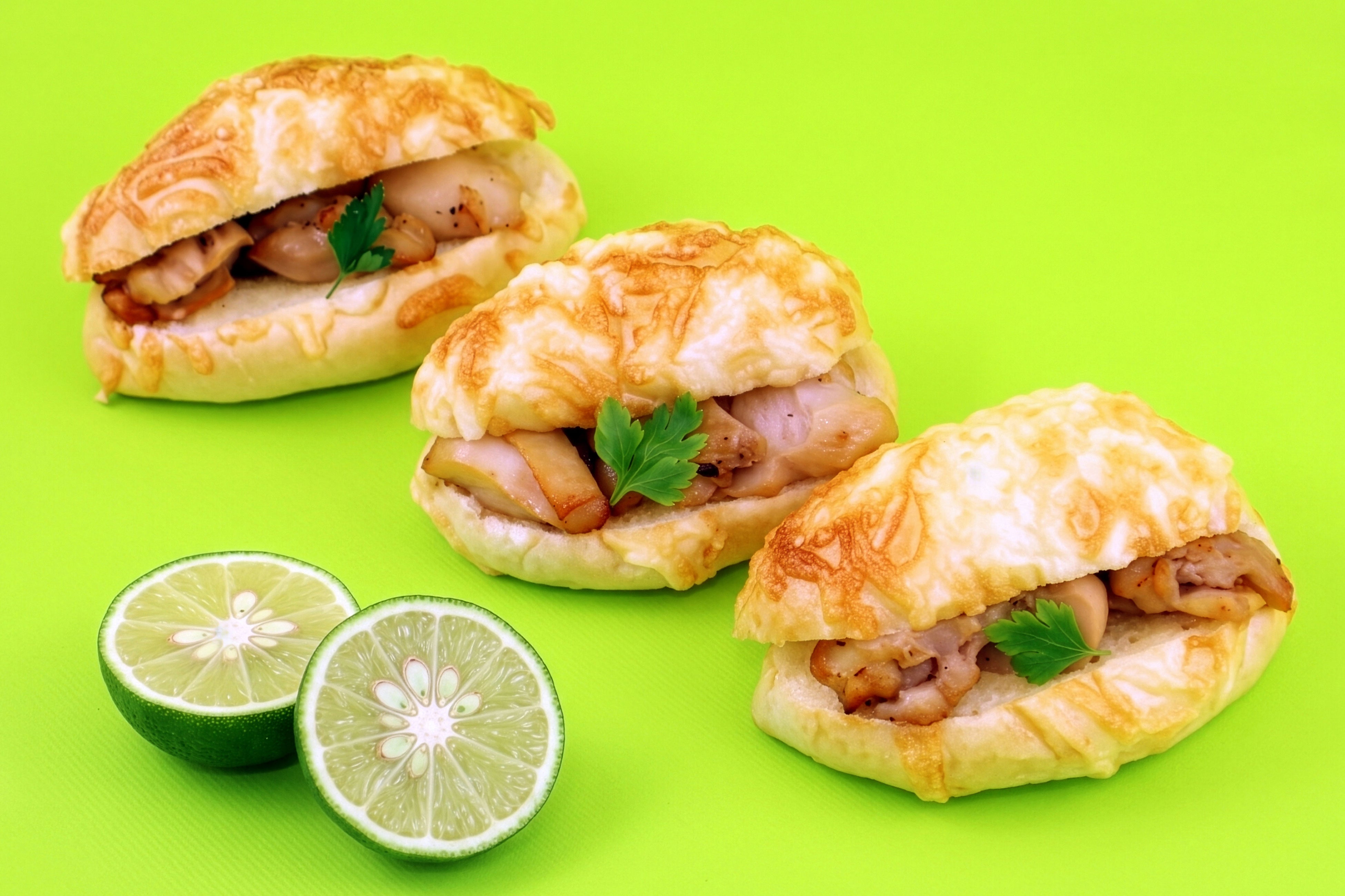 徳島県産の完熟すだちを使用した醤油だれで味付けしたチキンを挟み焼き上げました。