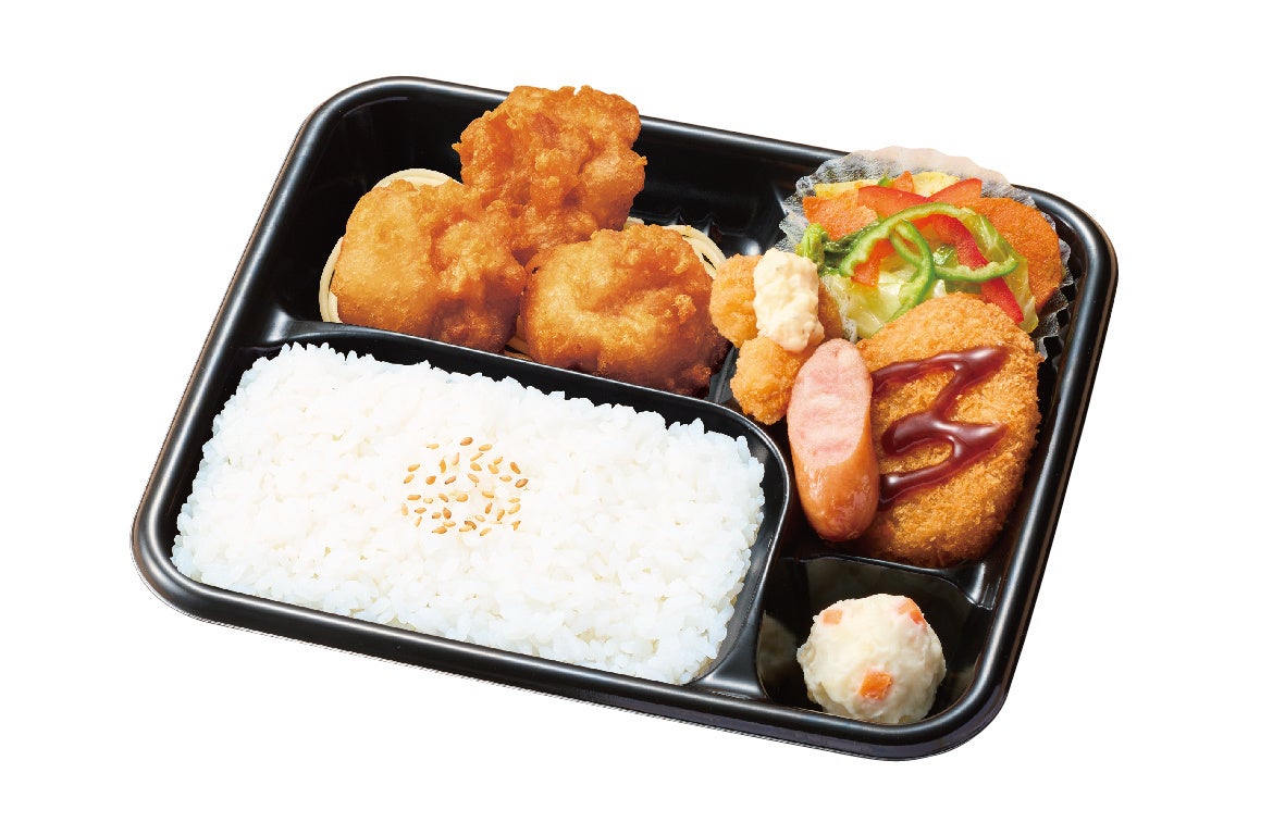 さらに、定番の人気を誇る唐揚や、タルタルソースがうれしいポップコーンシュリンプ、ほくほくと甘いコロッケ、ウインナーなど、大満足のおかずも勢ぞろい。お店でふっくらと炊き上げた、国産100%のごはんが進むラインナップです。