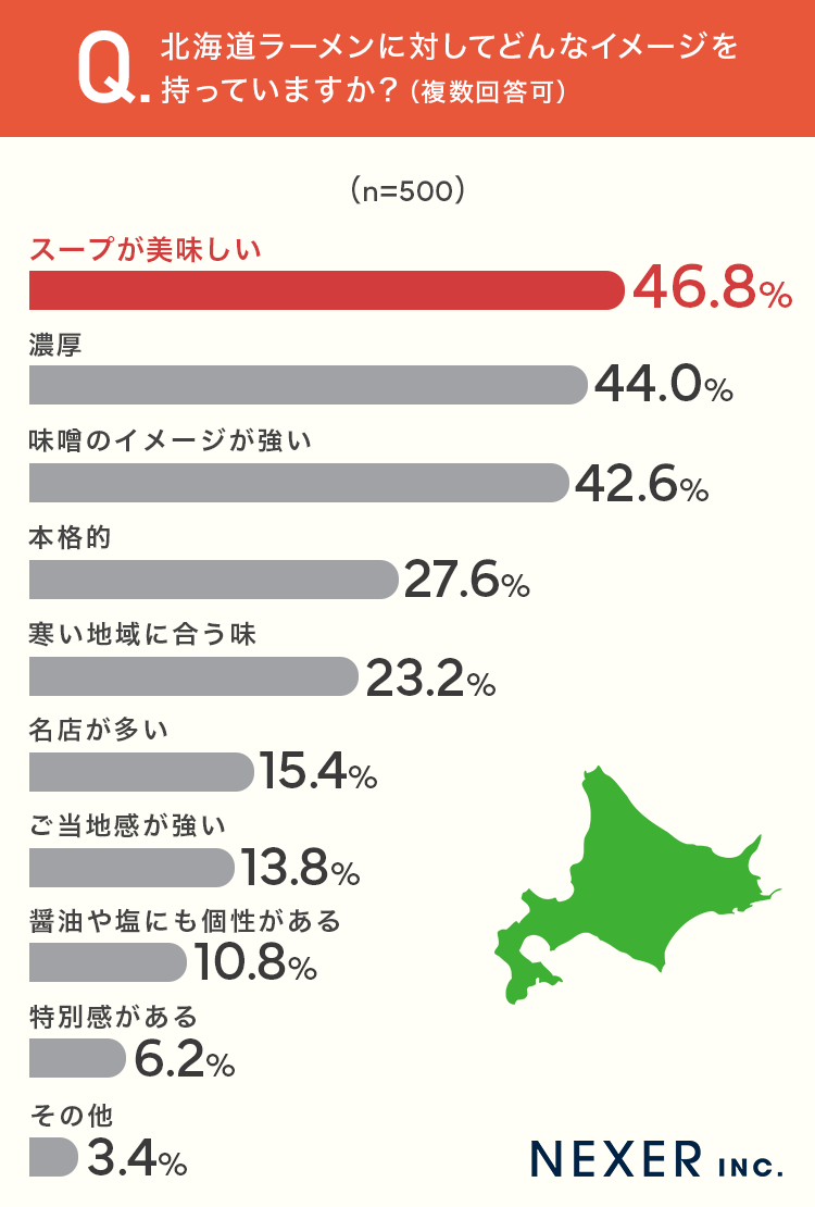 上位3つの回答はいずれも40%を超えており、北海道ラーメンには「スープが決め手の、濃厚な味噌ラーメン」というイメージが定着していることがわかります。