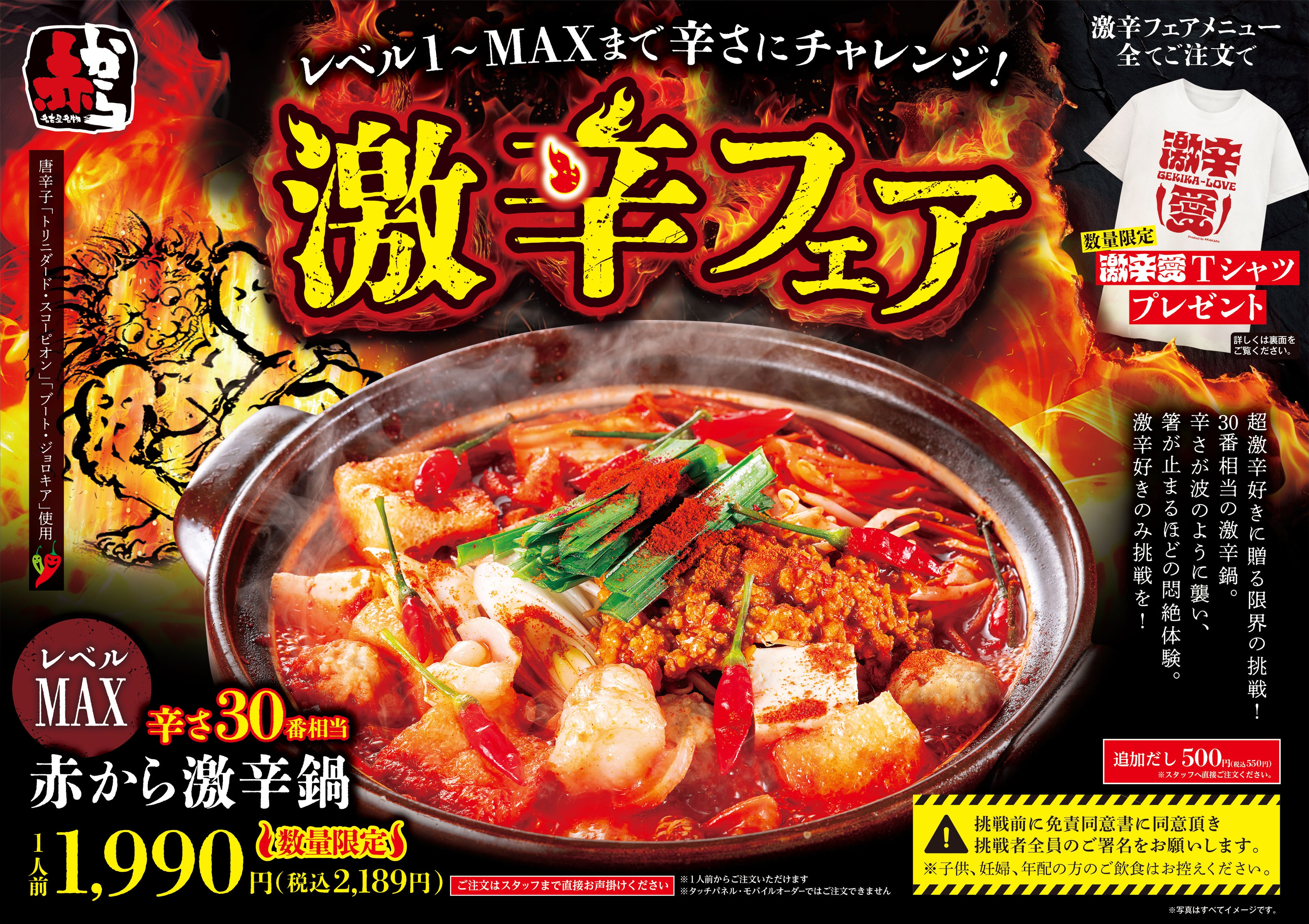 「おいしさと楽しさの創造」を理念に掲げる株式会社甲羅(本社:愛知県豊橋市、代表取締役社長:沼澤裕)が全国で150店舗以上を展開する鍋料理店「赤から」では、2026年5月19日(火)から6月30日(火)までの期間限定で辛さの限界に挑戦した「激辛フェア」を開催。同意書が必要な“危険な鍋”としてSNSなどで話題を集めた「赤から激辛鍋」をはじめ、今年はサイドメニューもさらにパワーアップ。まさに激辛好きのための特別企画となっています。ぜひ、この機会に赤からで刺激的な激辛体験をお楽しみください。