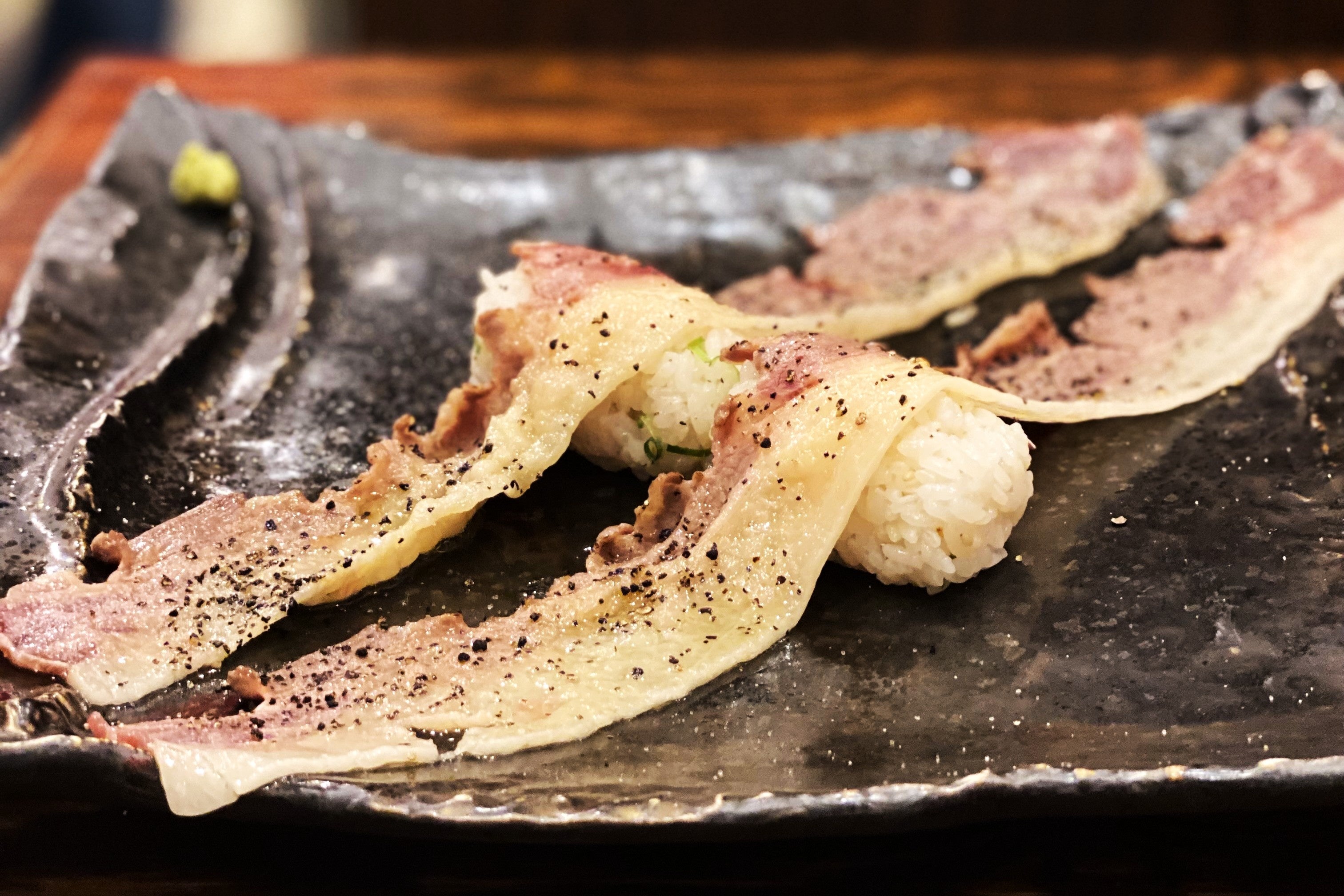 馬肉の中でも特に脂の旨味が強い“トモバラ”を使用し、香ばしく炙って仕上げた一貫。とろける食感と炙りの香りが食欲を引き立てる一品です。
