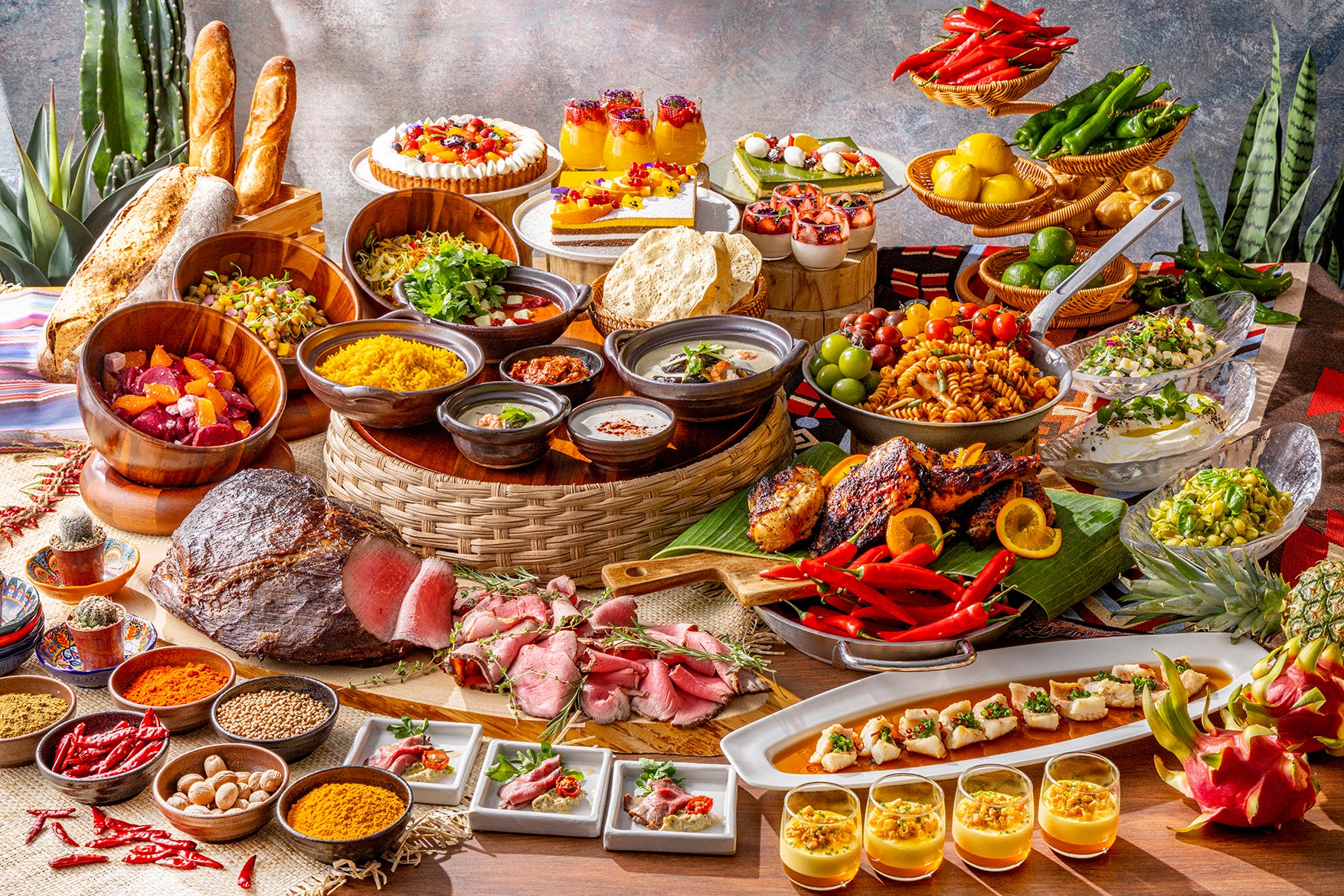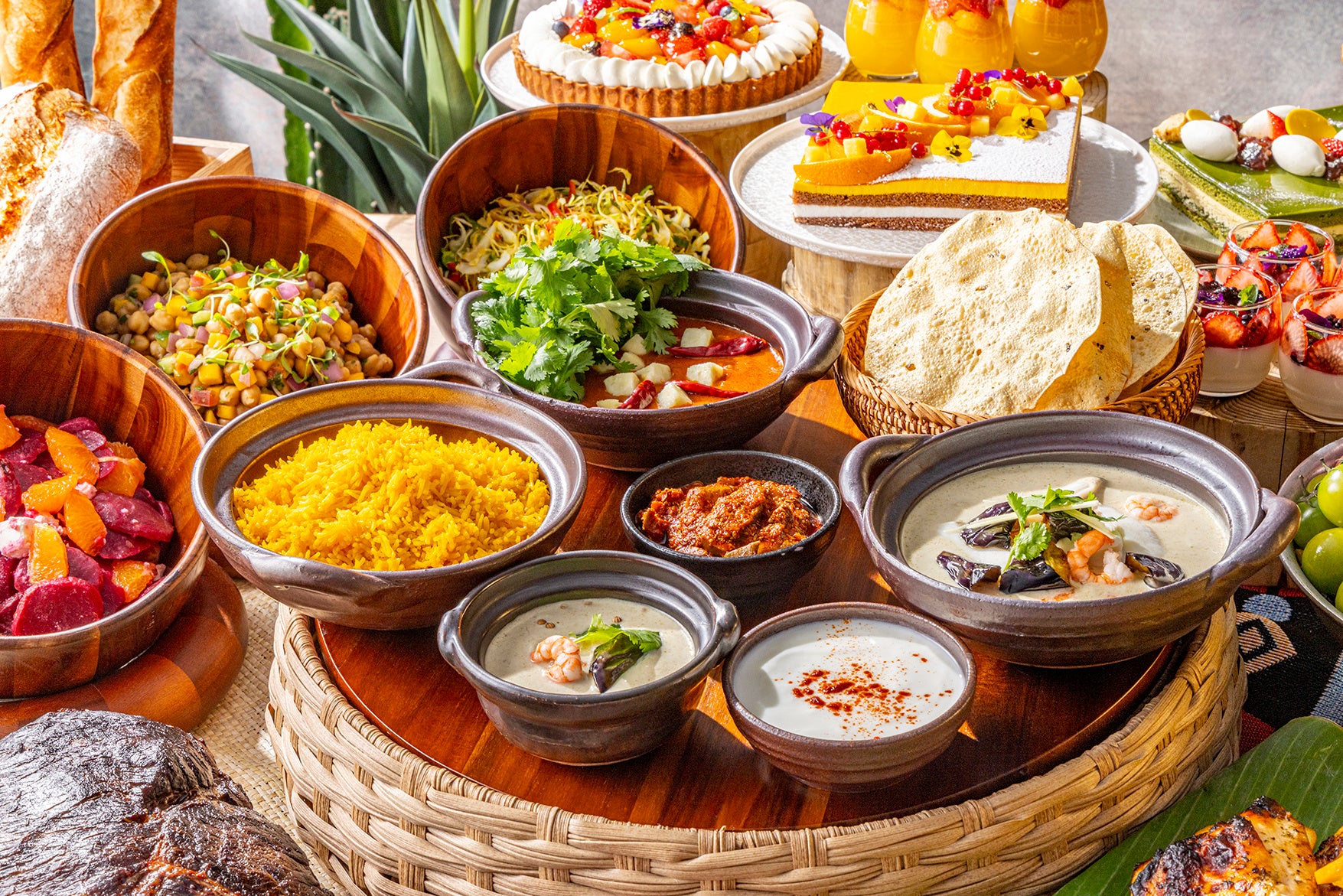 ライブコーナーではシェフが低温で5時間かけてじっくり火入れするローストビーフも登場。しっとりピンク色に仕上がったお肉を、赤ワインソースやおろしポン酢ソースと共にさっぱりとお召し上がりいただけます。インターナショナル色豊かなホットコーナーには、スパイスの香りが食欲を誘う料理が並びます。チキンを芳ばしく焼き上げた後、オレンジの甘酸っぱさと生姜や唐辛子をアクセントに加えたソースで仕上げる「オリエンタルオレンジチキン」、白身魚にたっぷりの香辛料をまぶし、高温で芳ばしく焼き上げる「ブラッケンドフィッシュ」、インドのフレッシュチーズ、パニールを濃厚でまろやかなトマトバターソースで煮込んだ「パニールマカニ」、青唐辛子の爽やかな辛さとココナッツミルクが調和する「タイ風シーフードグリーンカレー」など多彩な味わいをお楽しみいただけます。