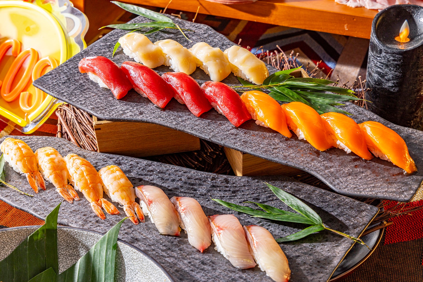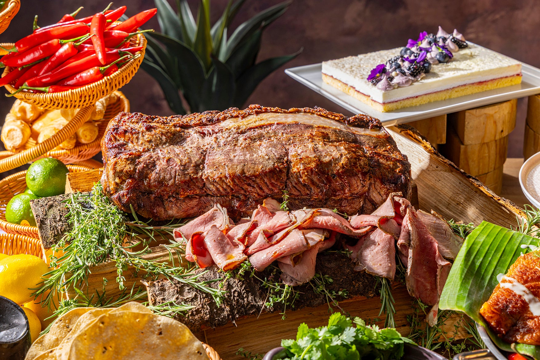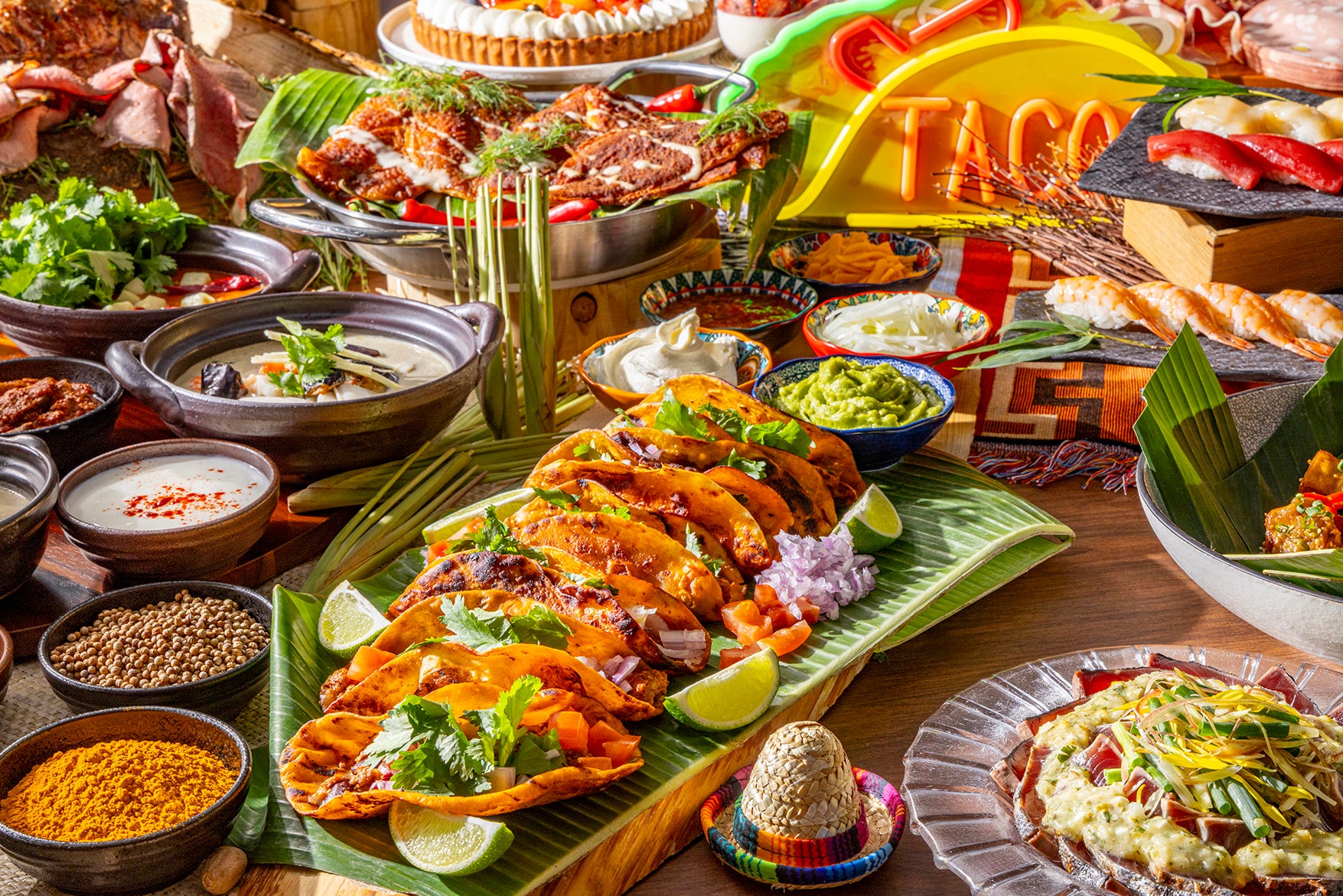 サラダバー、ローストビーフとアジアン・スパイス満載のランチビュッフェ。新登場タコスや寿司のライブカウンターも揃うディナービュッフェ