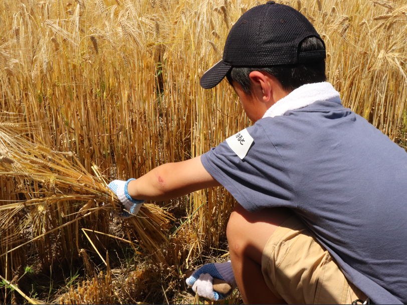 2024年5月18日(土)に実施した「もち麦体験教室」では、収穫体験ともち麦おにぎり作りを行いました。まずは座学でもち麦の生育や食物繊維について学んだ後、畑へ移動して収穫体験を行いました。現在、収穫は主に機械で行われますが、この日は子どもたちに農業体験をしてもらうべく「鎌」を使用しました。最初は恐るおそるだった子どもたちも、慣れると手際よく刈り取り、大きな束を抱えて得意げに保護者に見せる姿が見られました。当日は晴天に恵まれ、汗をかきながらの作業となりましたが、「脱穀が難しかったけど、自分で刈るのは面白かった」とのコメント。苦労して収穫する喜びを学び、最後には「たのしかった!」とその日最高の笑顔が溢れる一日となりました。