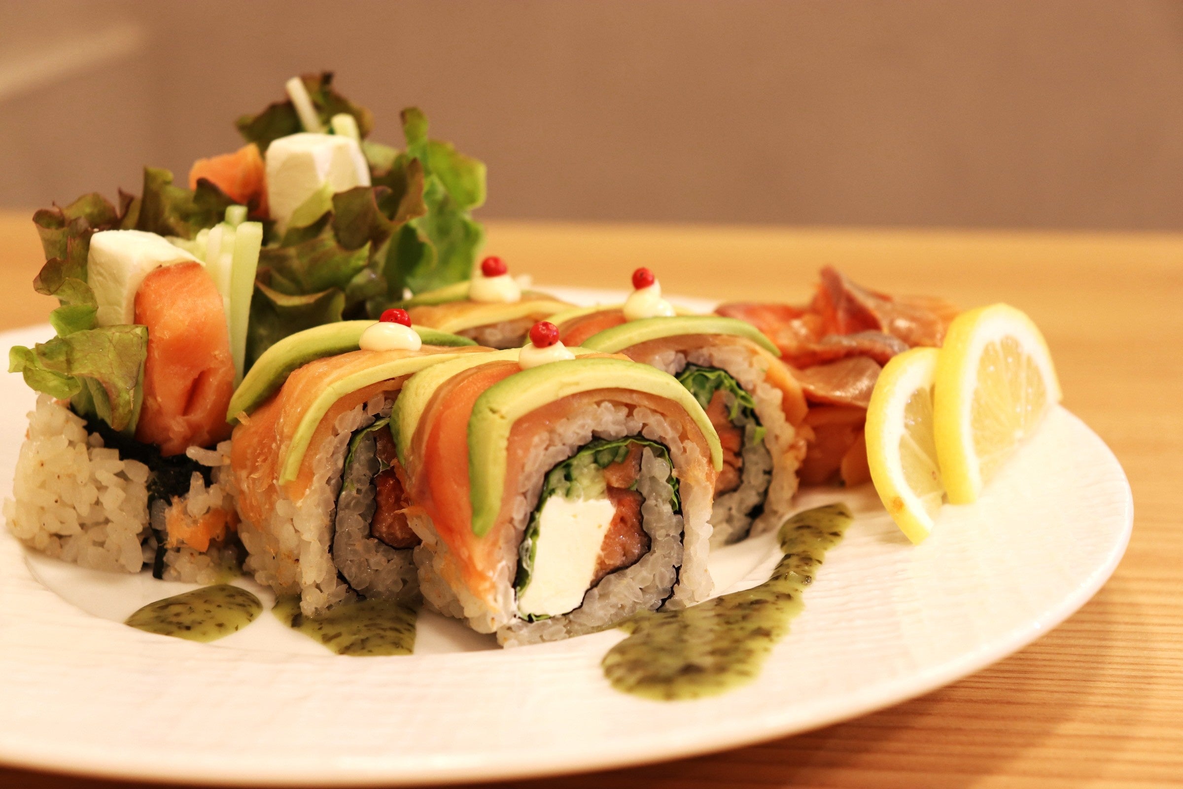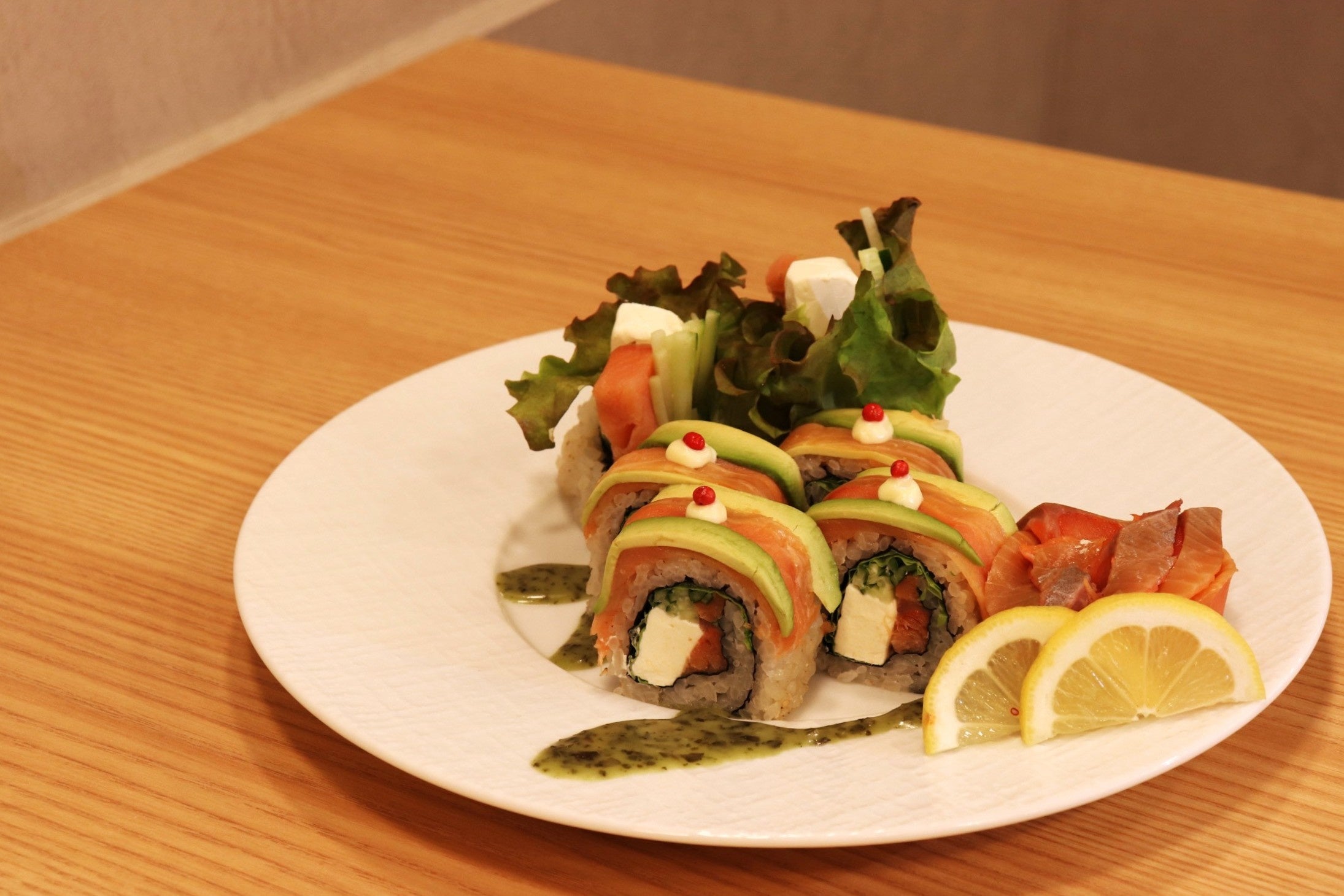 断面から見える具材の重なりと、オレンジ・グリーン・ホワイトのコントラストは、思わず写真に収めたくなる華やかさ。一口食べると、スモークサーモンの旨味とチーズのコクが広がり、アボカドが全体を包み込むように調和します。バジルソースの香りがアクセントとなり、濃厚でありながら軽やかに食べ進められるバランスに仕上げています。寿司としてだけでなく、一皿の料理としても楽しめる新しいスタイルです。
