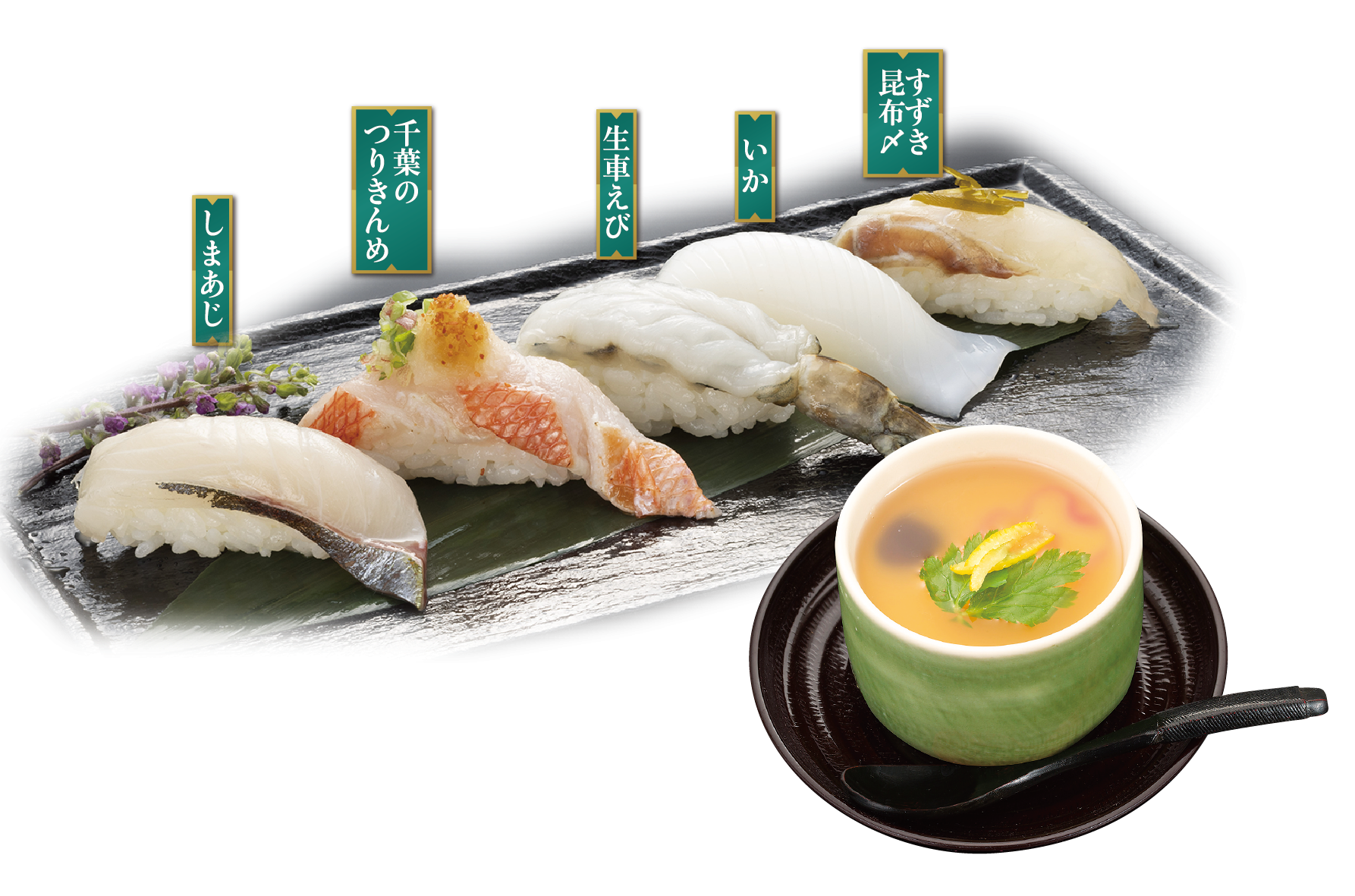 初夏の特選五貫盛り(しまあじ・千葉のつりきんめ・生車えび・いか・すずき昆布〆)・茶碗蒸し付き