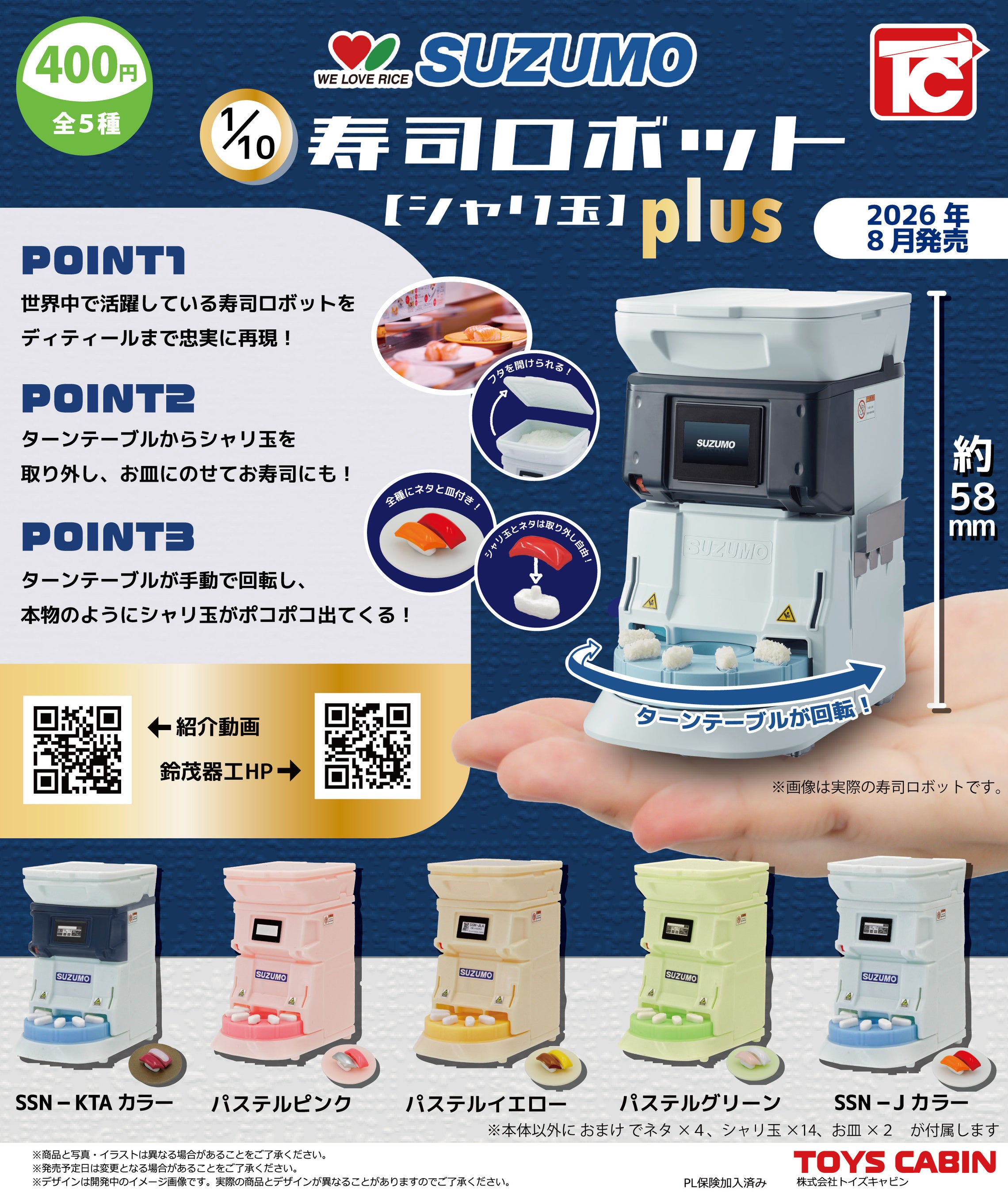 鈴茂器工株式会社(本社:東京都中野区、代表取締役社長:谷口徹、以下 鈴茂器工)は、カプセルトイメーカー株式会社トイズキャビン(本社:静岡県静岡市、代表取締役:山西秀晃、以下 トイズキャビン)とのコラボレーションによるカプセルトイ「1/10 SUZUMO 寿司ロボット(シャリ玉)plus」を、2026年8月より全国で順次発売することをお知らせいたします。
