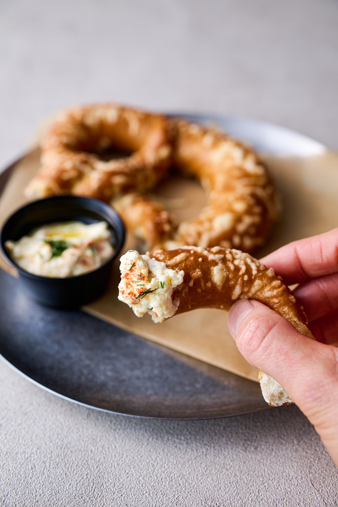 香ばしいチーズプレッツェルと、大豆のコク深いフムスのマリアージュ。