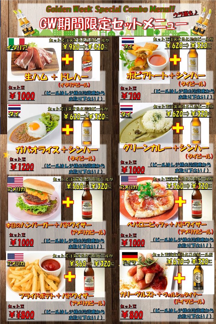 生ハムとドレハー(イタリア)、スパイシーナチョスとコロナ(メキシコ)、フィッシュアンドチップスとロンドンプライド(イギリス)、ガパオライスとシンハー(タイ)など全16種類の人気メニューをお得なセットで販売いたします。