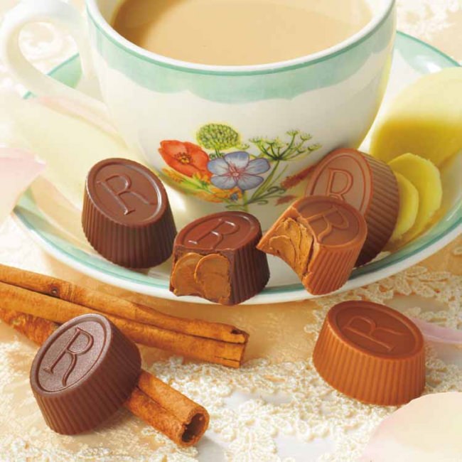 ひと口サイズのショコラで、2種類のミルクティーの風味を表現しました。ジンジャーがふわりと香るミルクティークリームを、ほんのり紅茶風味のミルクチョコレートに閉じ込めた「ジンジャー」と、シナモンが効いたミルクティークリームを、甘さ控えめのチョコレートに閉じ込めた「シナモン」。どちらもカリッとしたクッキークランチがアクセント。しっかりと紅茶が香りながらもカカオと調和し、まろやかな余韻を残します。