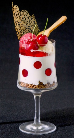 真っ赤なチェリーが“ドット柄”になった、見た目にも可愛らしいパフェです。